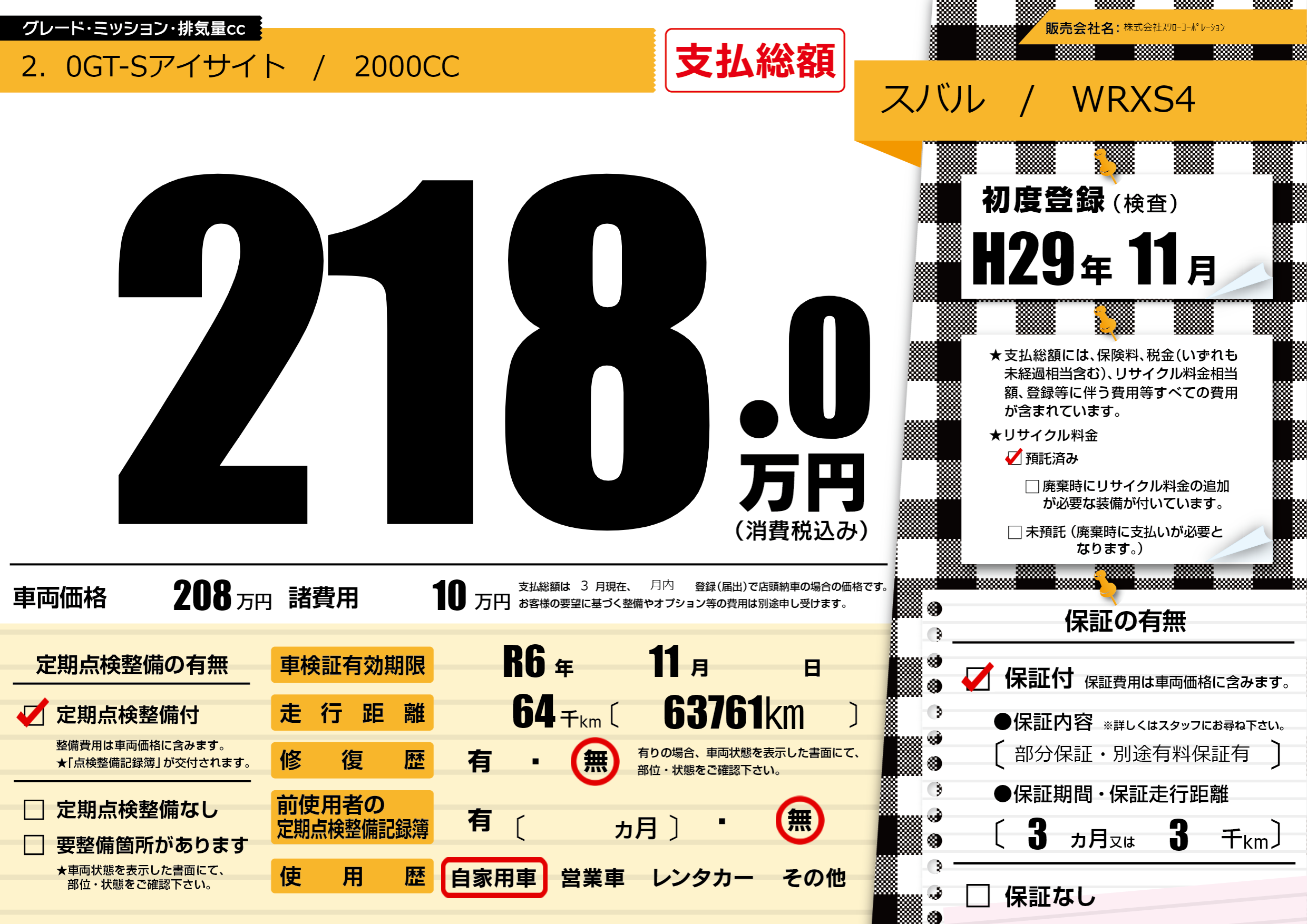 | 車名 | スバル / WRXS4 | グレード ミッション 排気量 |