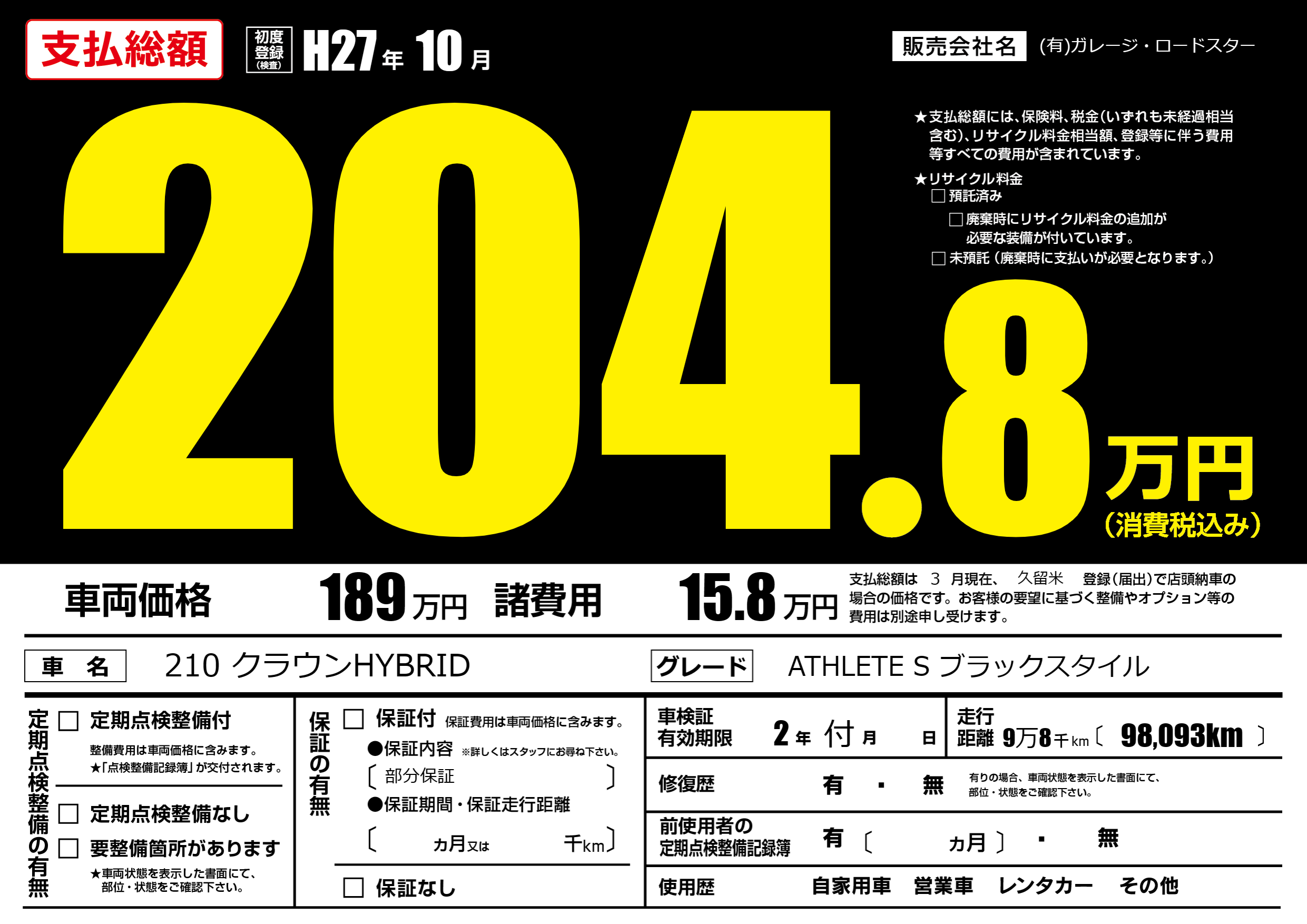 | 車名 | 210 クラウンHYBRID | グレード ミッション 排気量 |