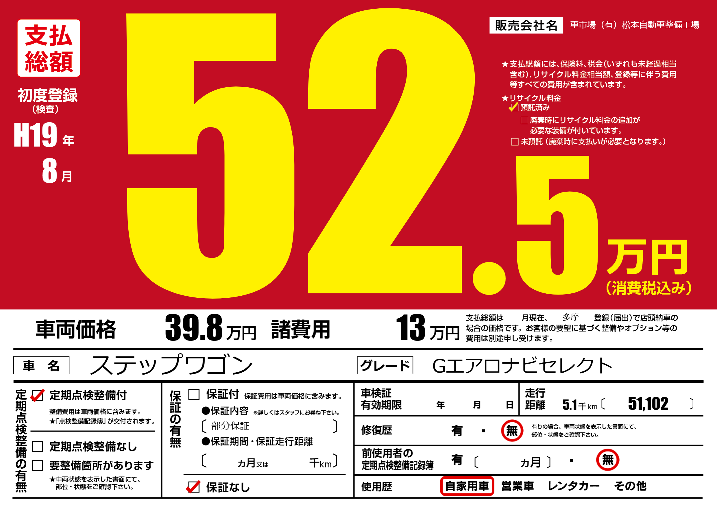| 車名 | ステップワゴン | グレード ミッション 排気量 |