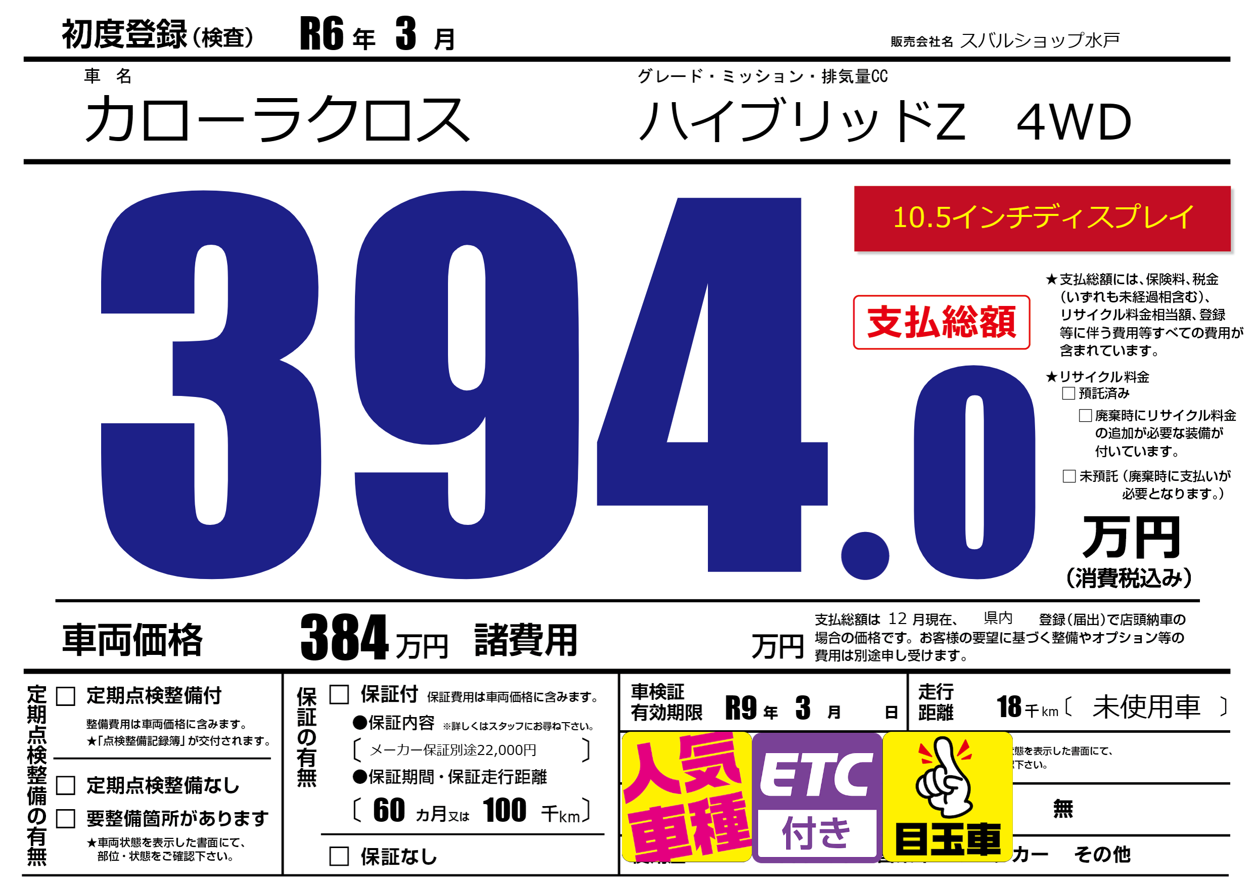| 車検制限 | R9年 3月 - 日 | ||