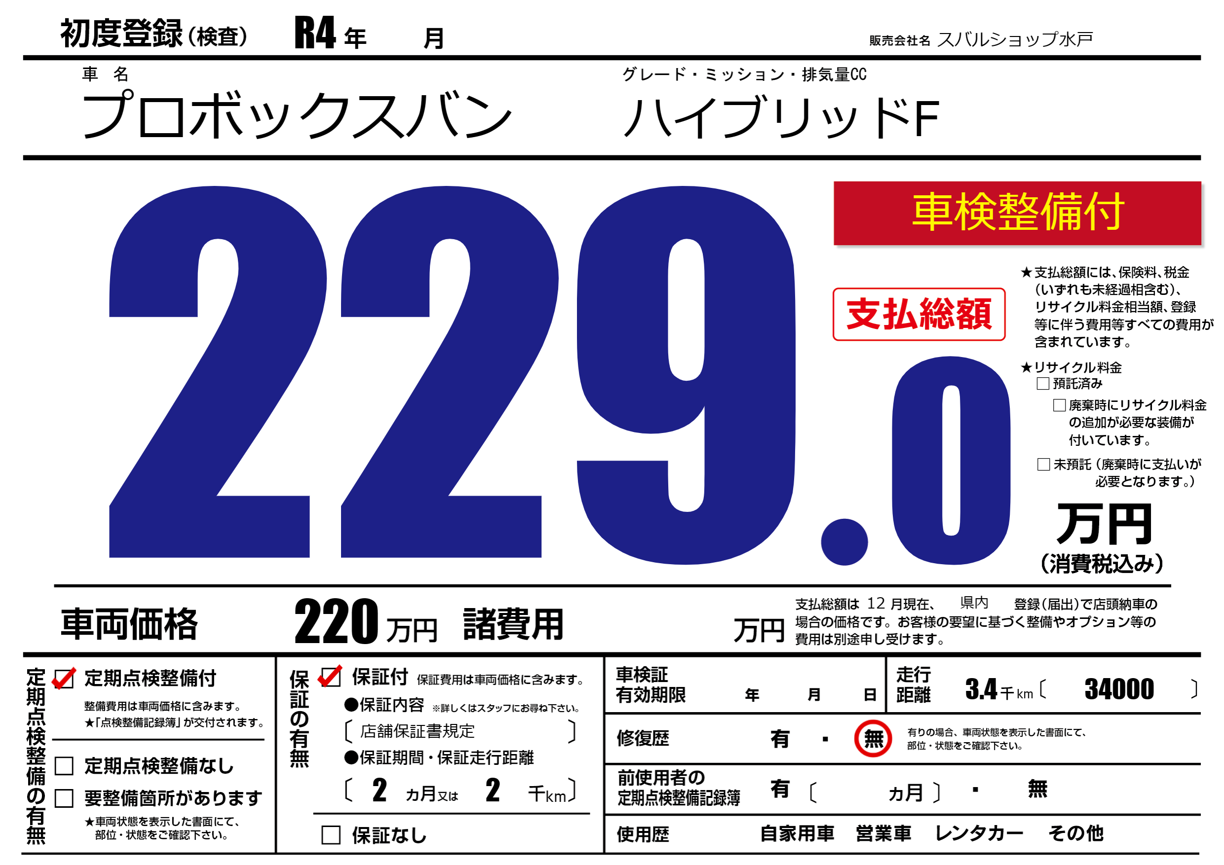 | 車名 | プロボックスバン | グレード ミッション 排気量 |