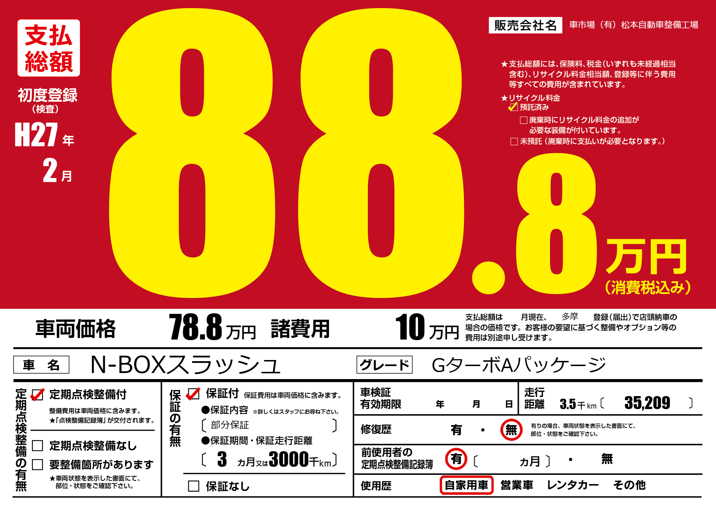 | 車名 | N-BOXスラッシュ | グレード ミッション 排気量 |