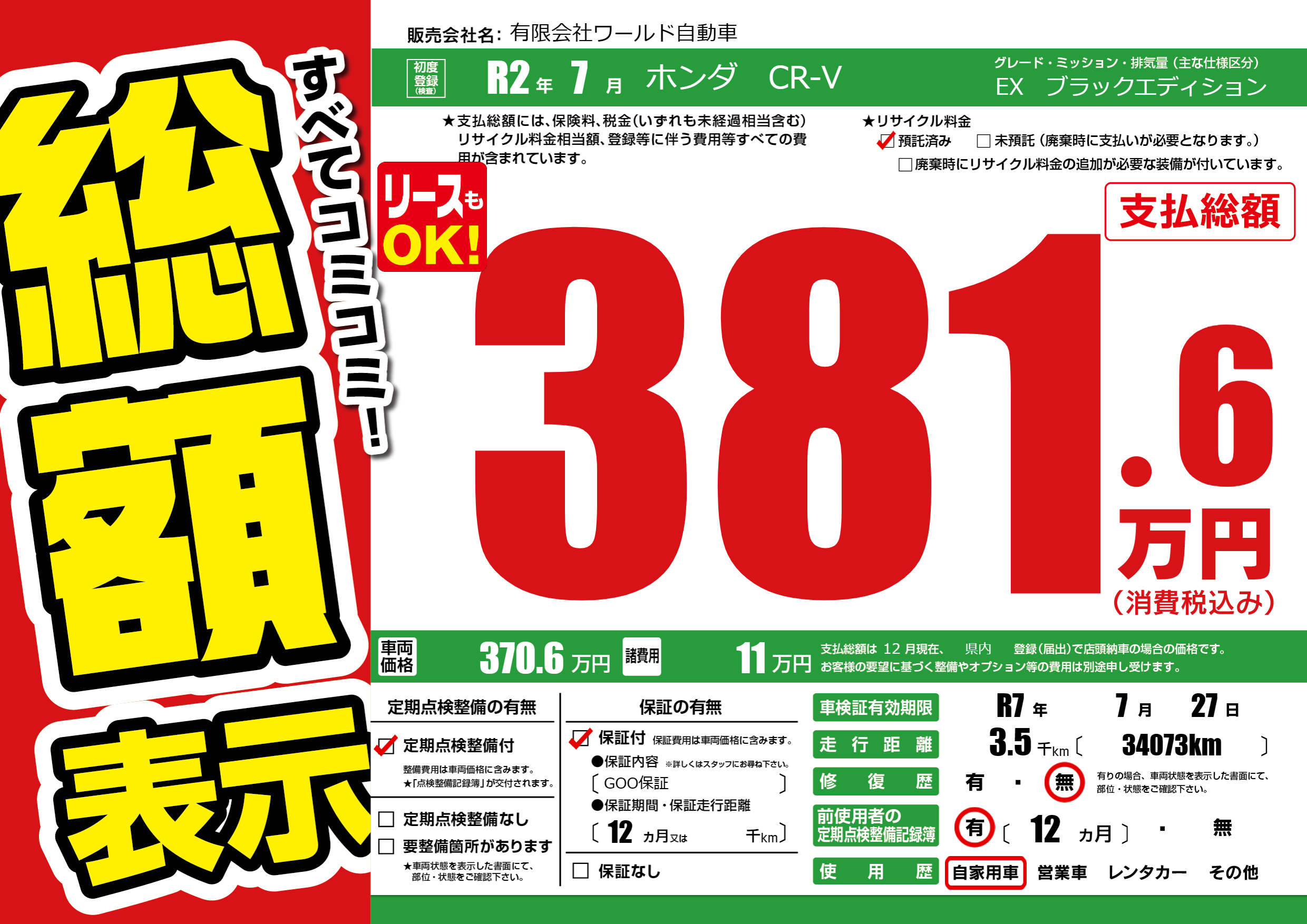 | 車名 | ホンダ CR-V | グレード ミッション 排気量 |