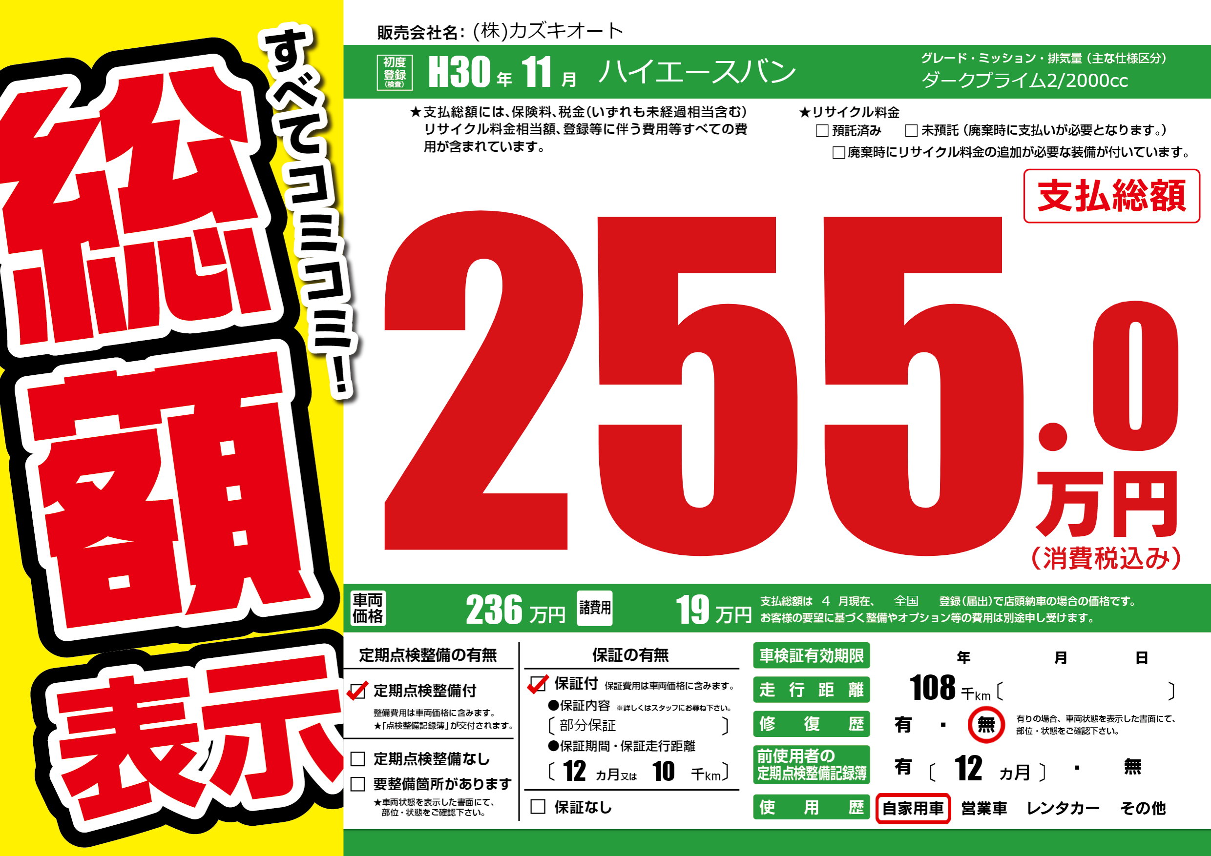 | 走行キロ | 10.8万km | 初年度登録 | H30年11月 |