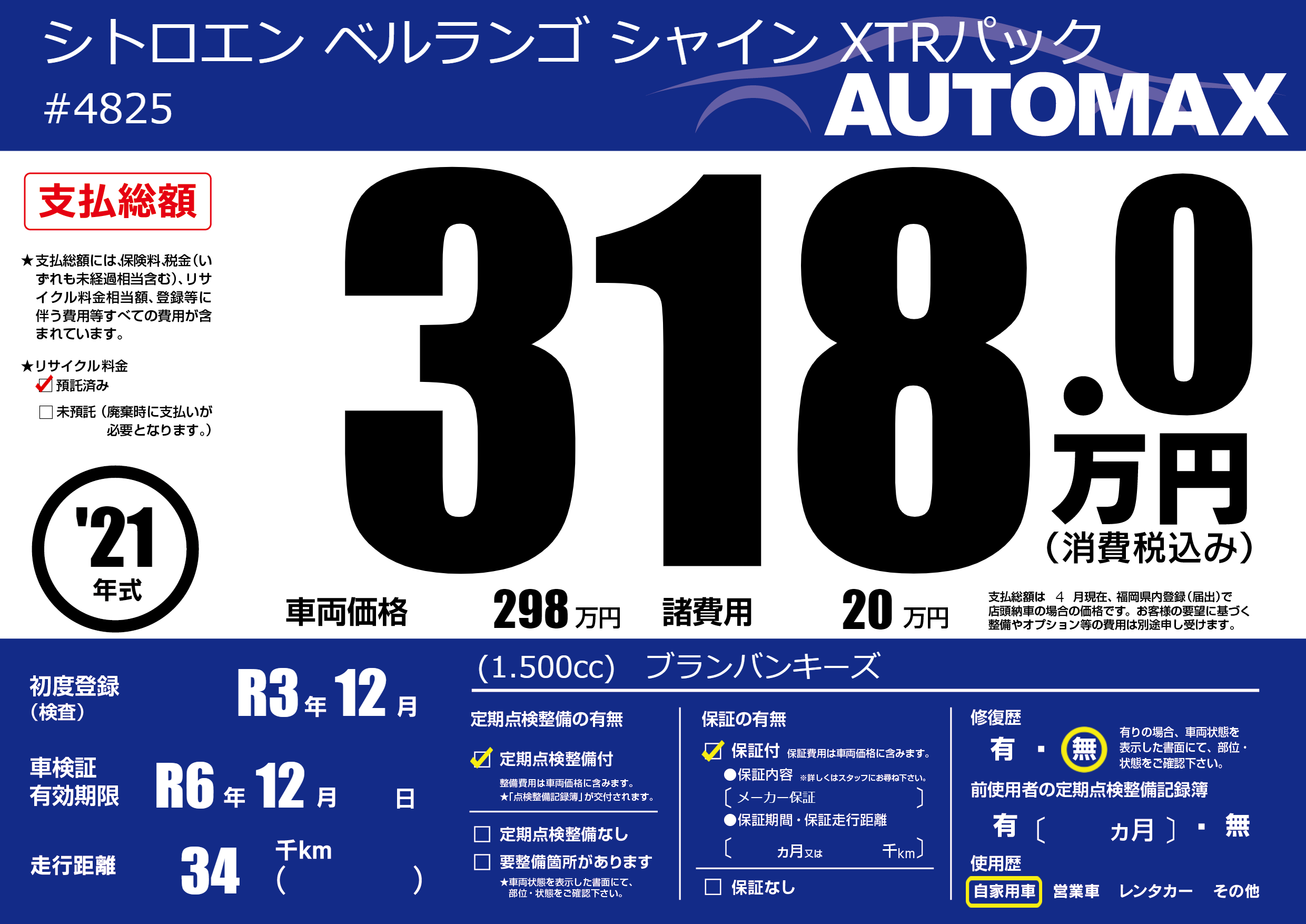 | 車名 | シトロエン ベルランゴ シャイン XTRパック | グレード ミッション 排気量 |