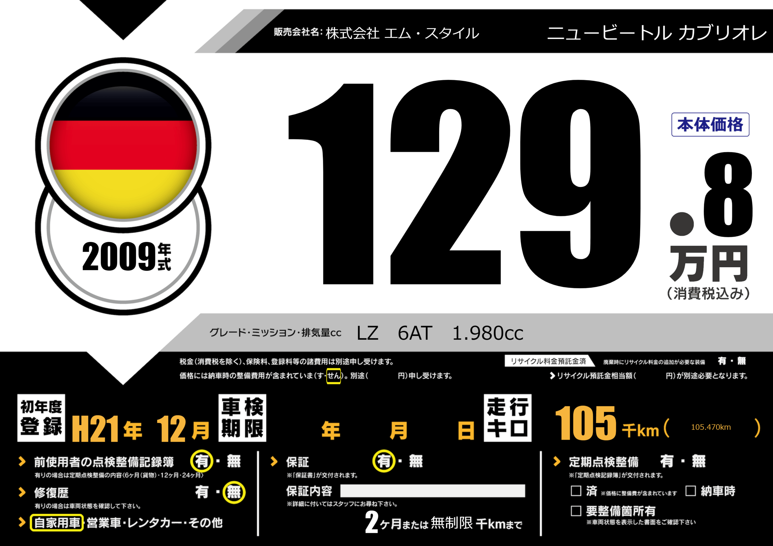 保証付き 保証内容() 2ヶ月または無制限千km |