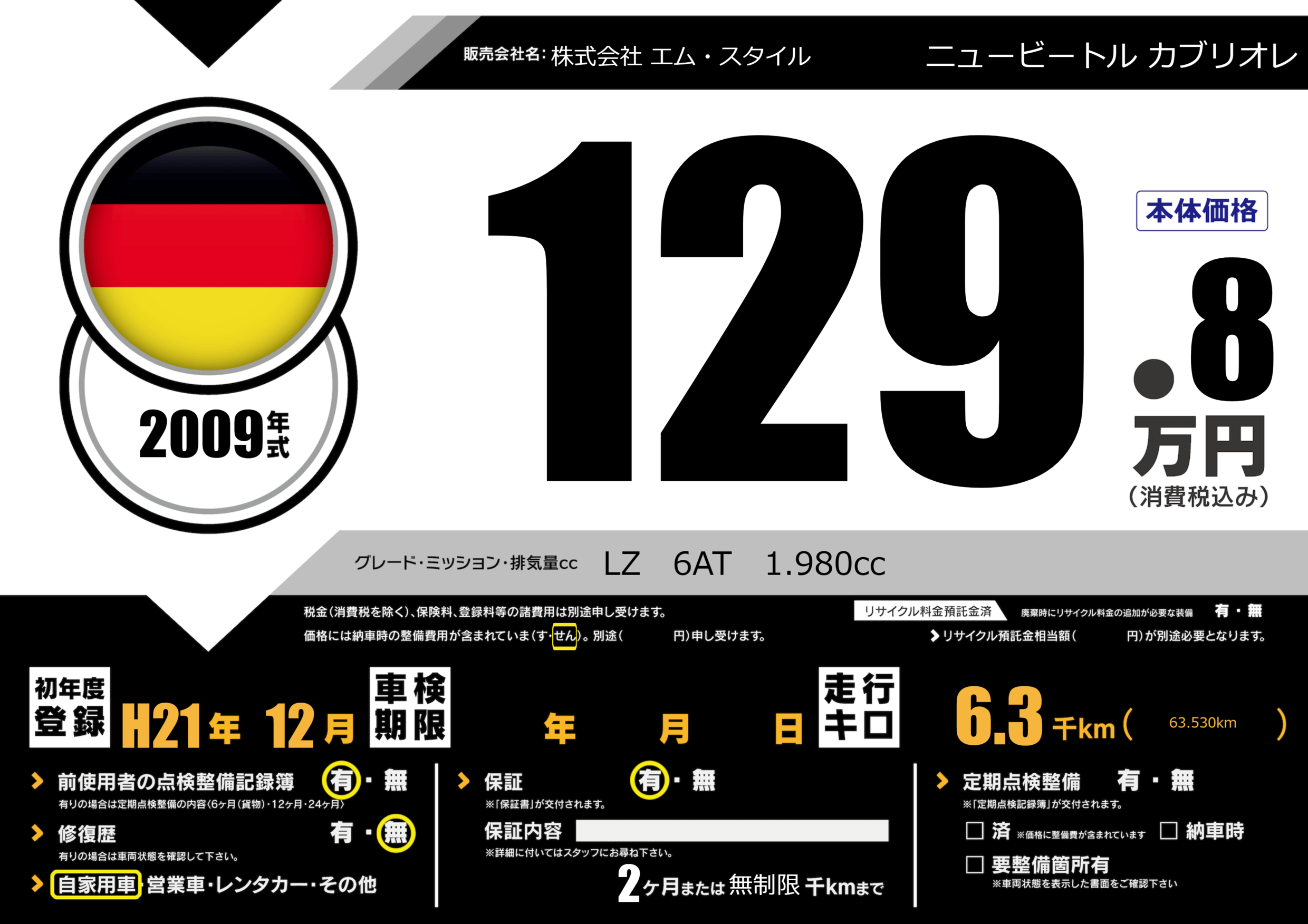 | 車名 | ニュービートル カブリオレ | グレード ミッション 排気量 |