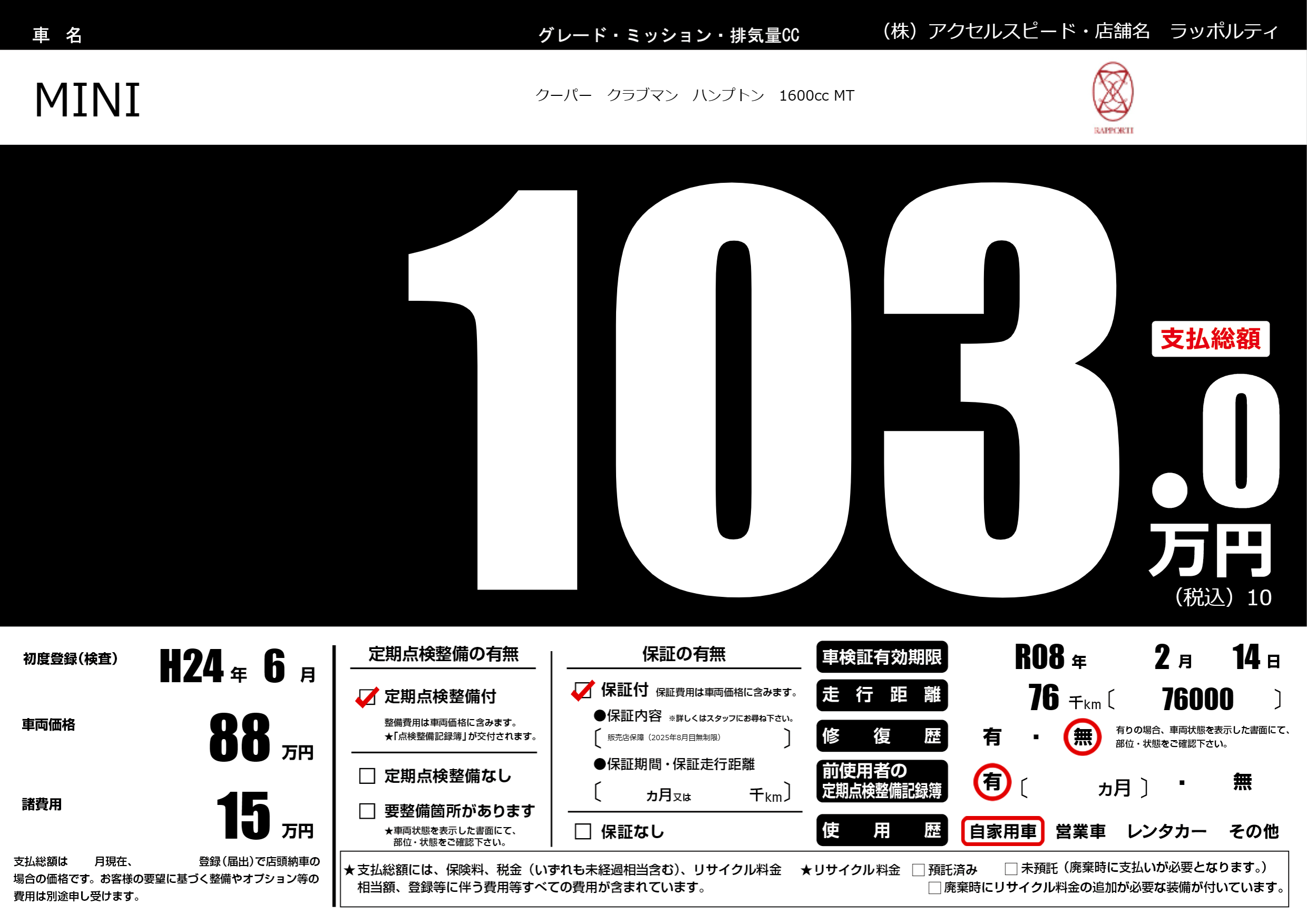 | 走行キロ | 7.6万km | 初年度登録 | H24年6月 |