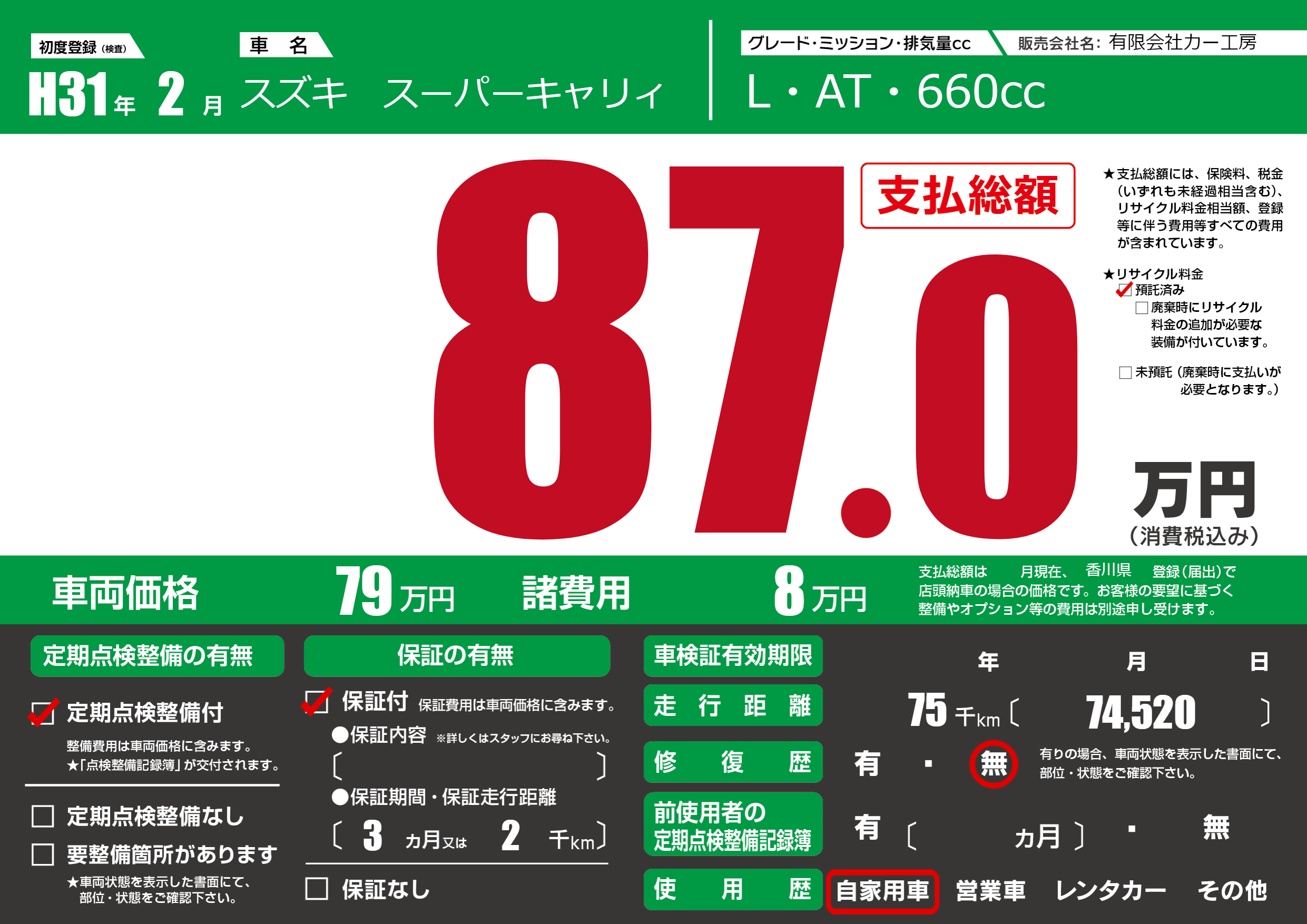 | 車名 | スズキ スーパーキャリィ | グレード ミッション 排気量 |
