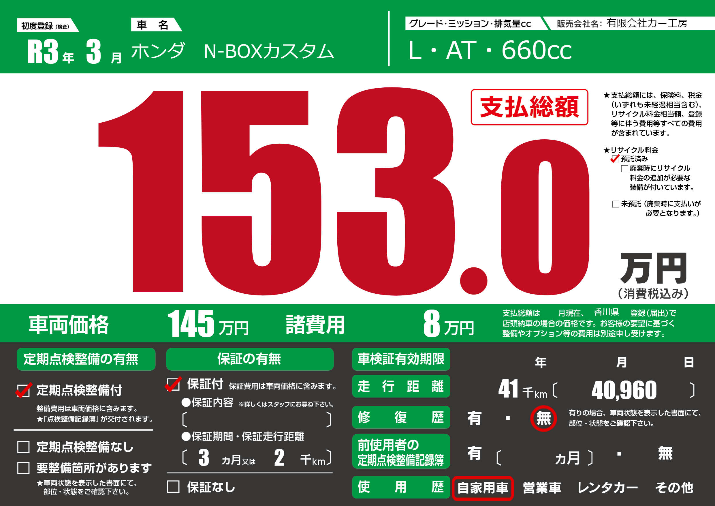 | 車名 | ホンダ N-BOXカスタム | グレード ミッション 排気量 |