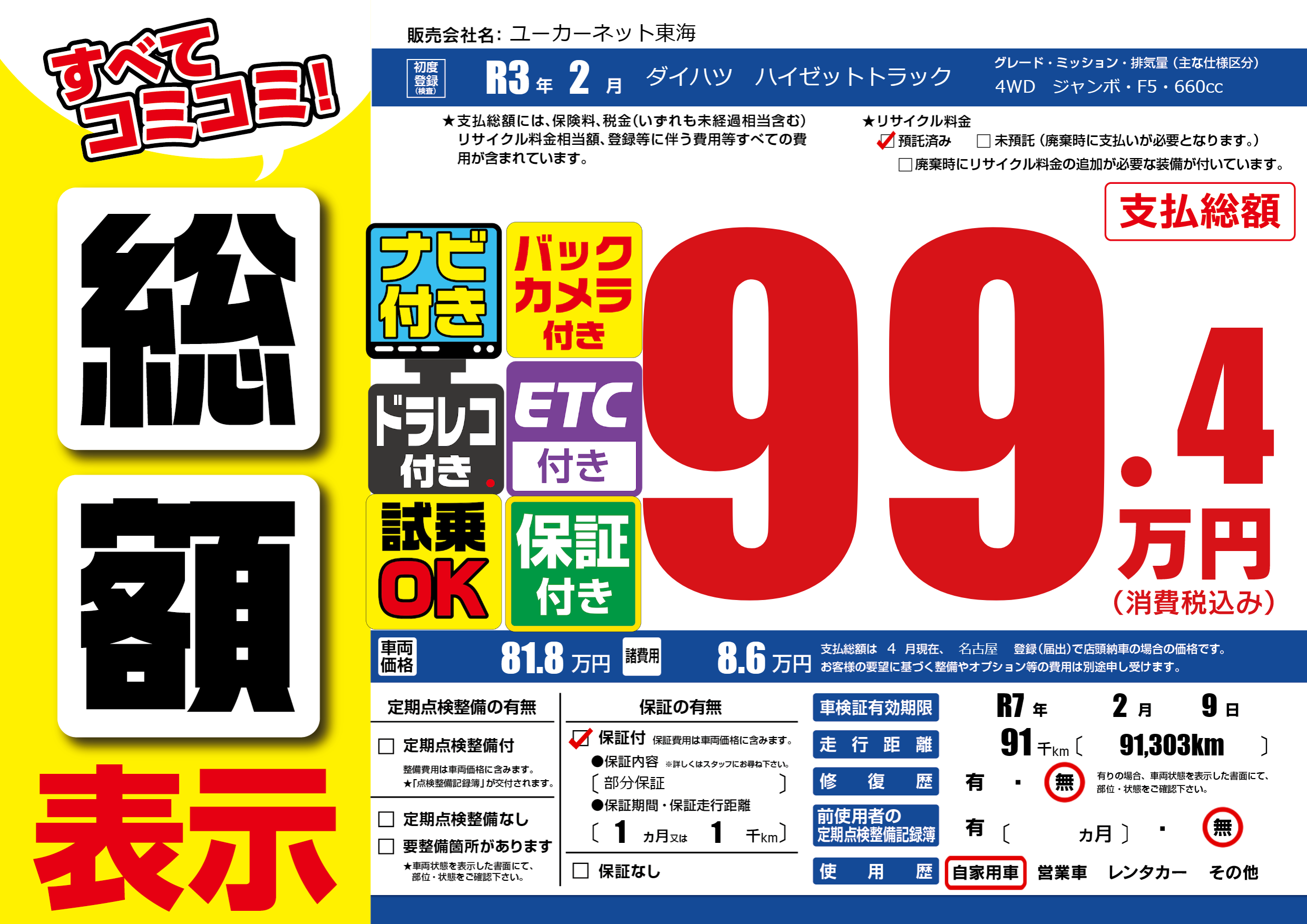 | 走行キロ | 9.1万km | 初年度登録 | R3年2月 |