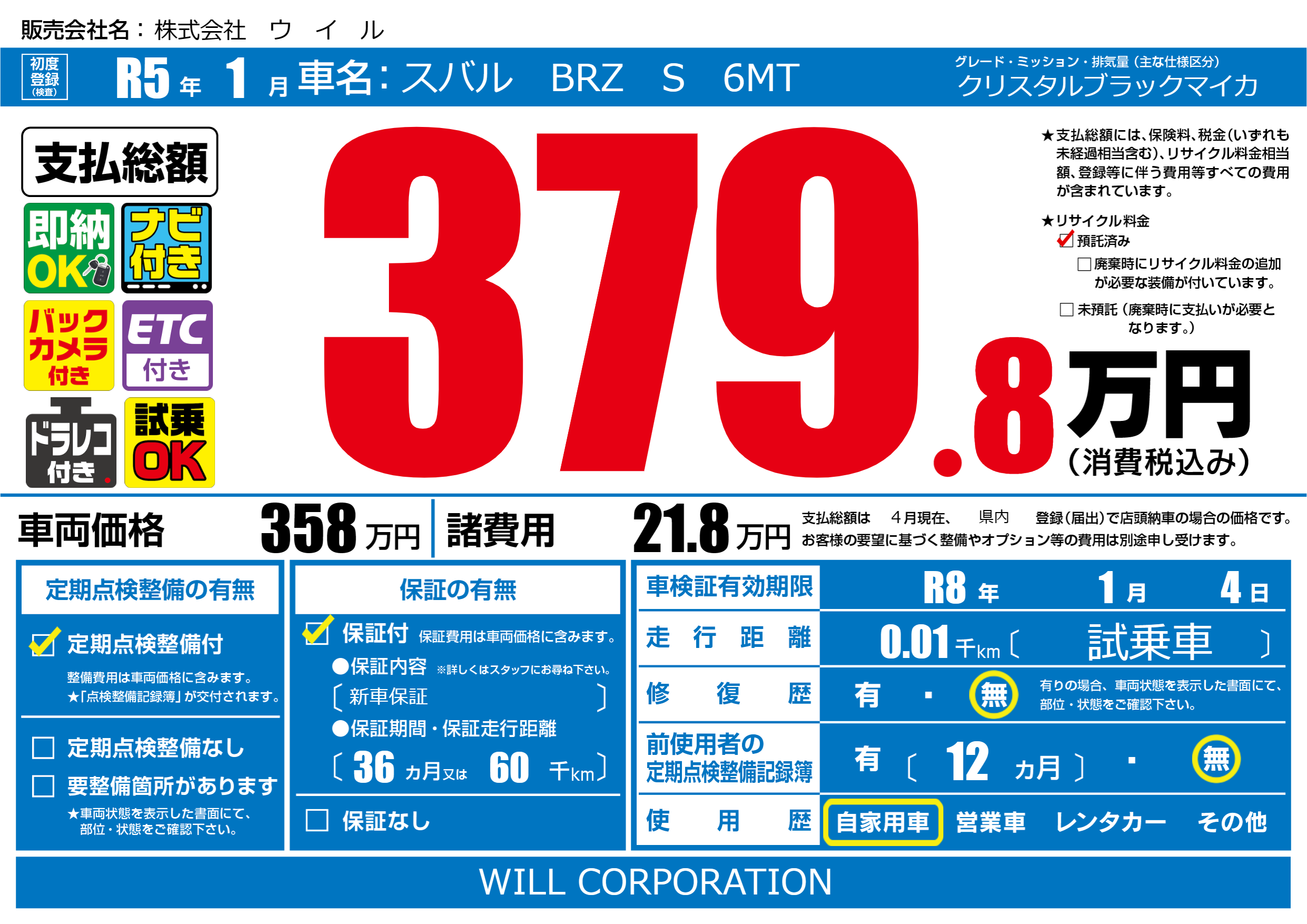 | 車名 | スバル BRZ S 6MT | グレード ミッション 排気量 |