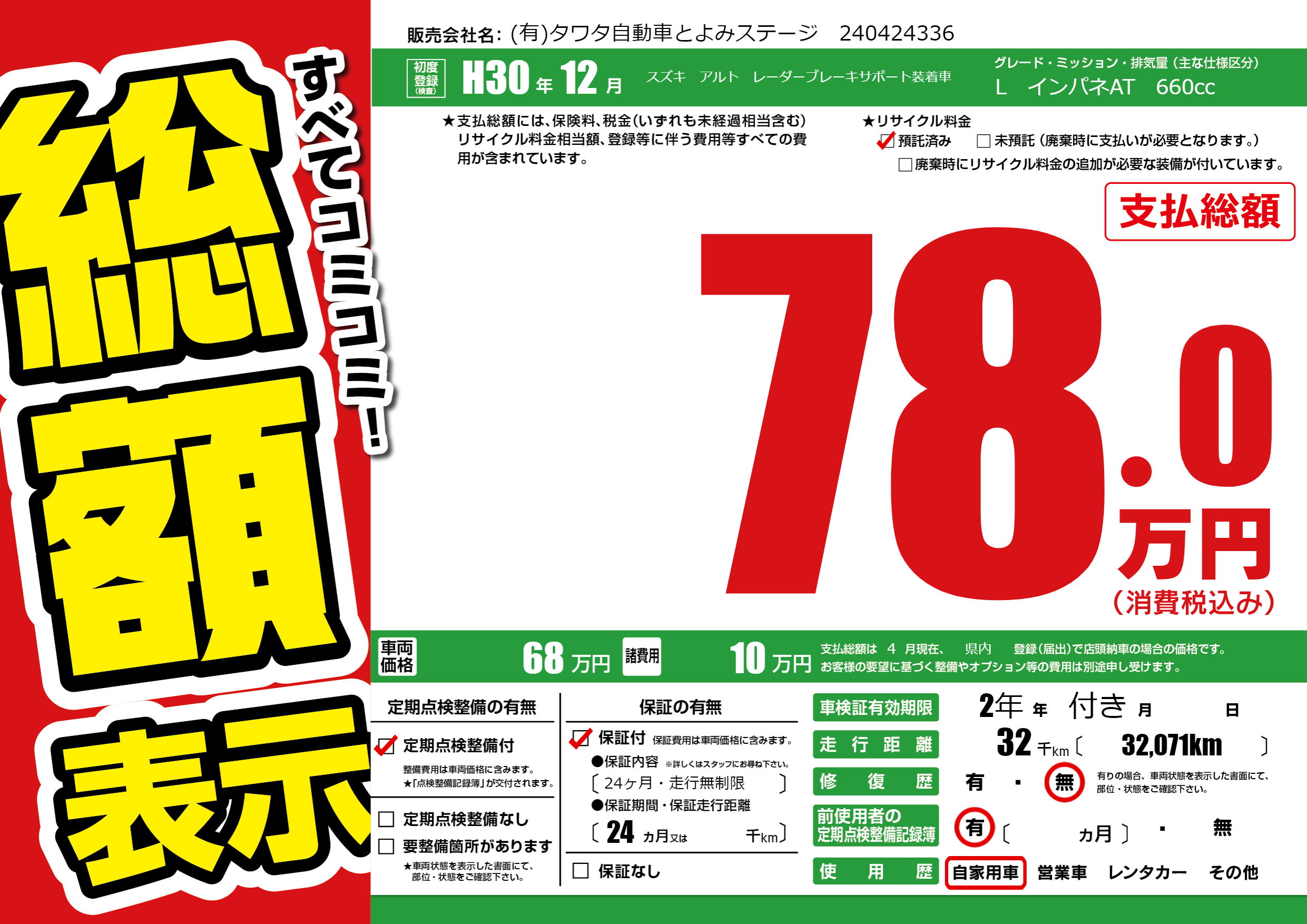 | 車名 | スズキ アルト レーダーブレーキサポート装着車 | グレード ミッション 排気量 |