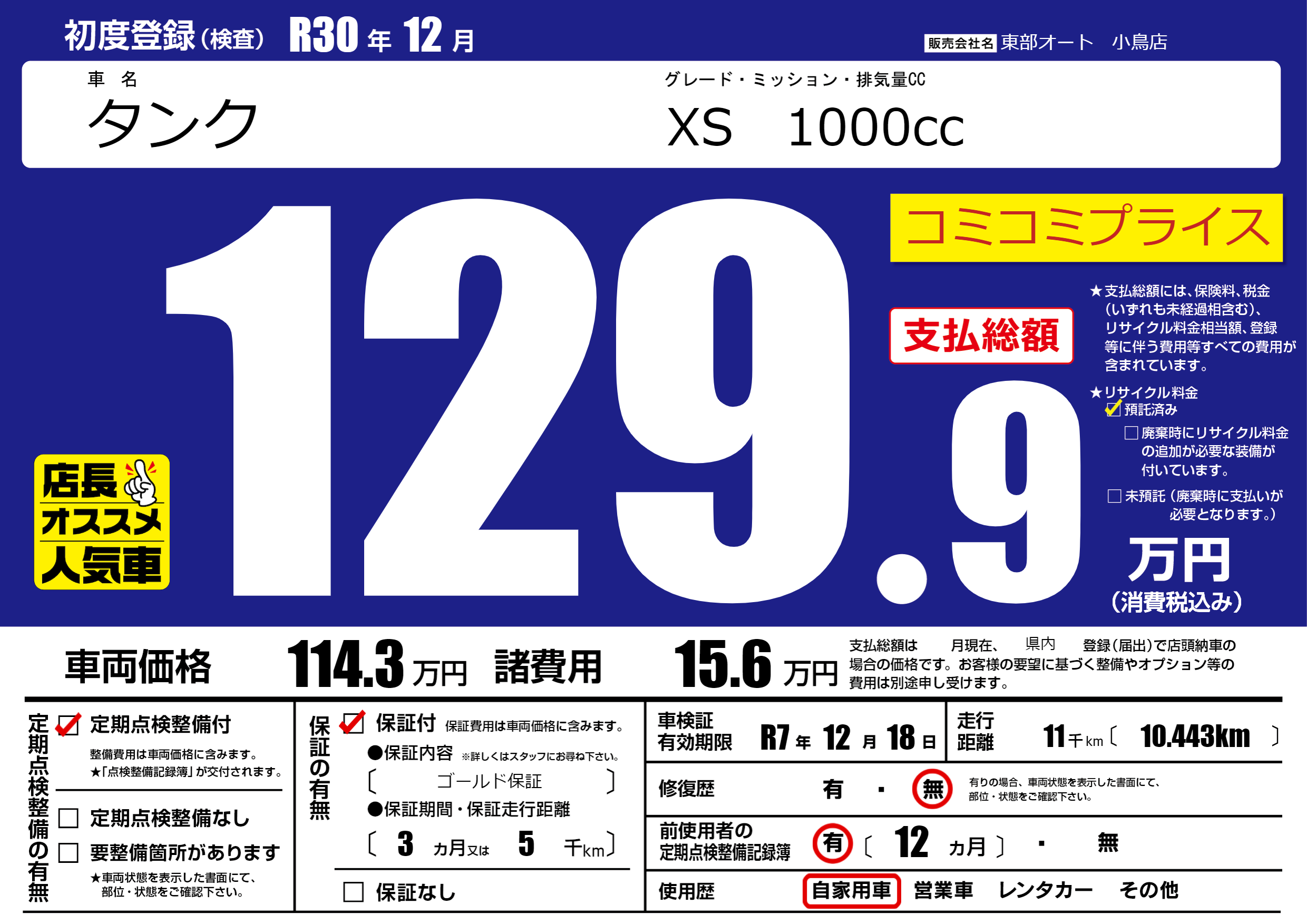 | 走行キロ | 1.1万km | 初年度登録 | R30年12月 |