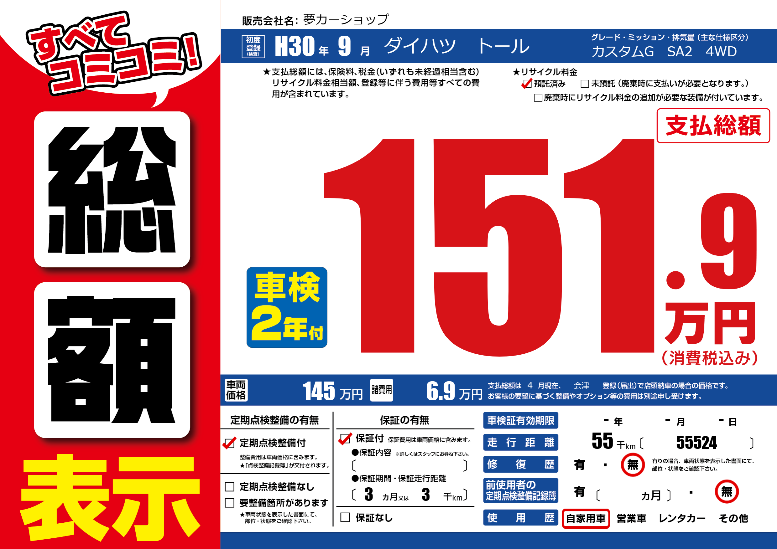 保証付き 保証内容(---) 3ヶ月または(3)千kmまで |