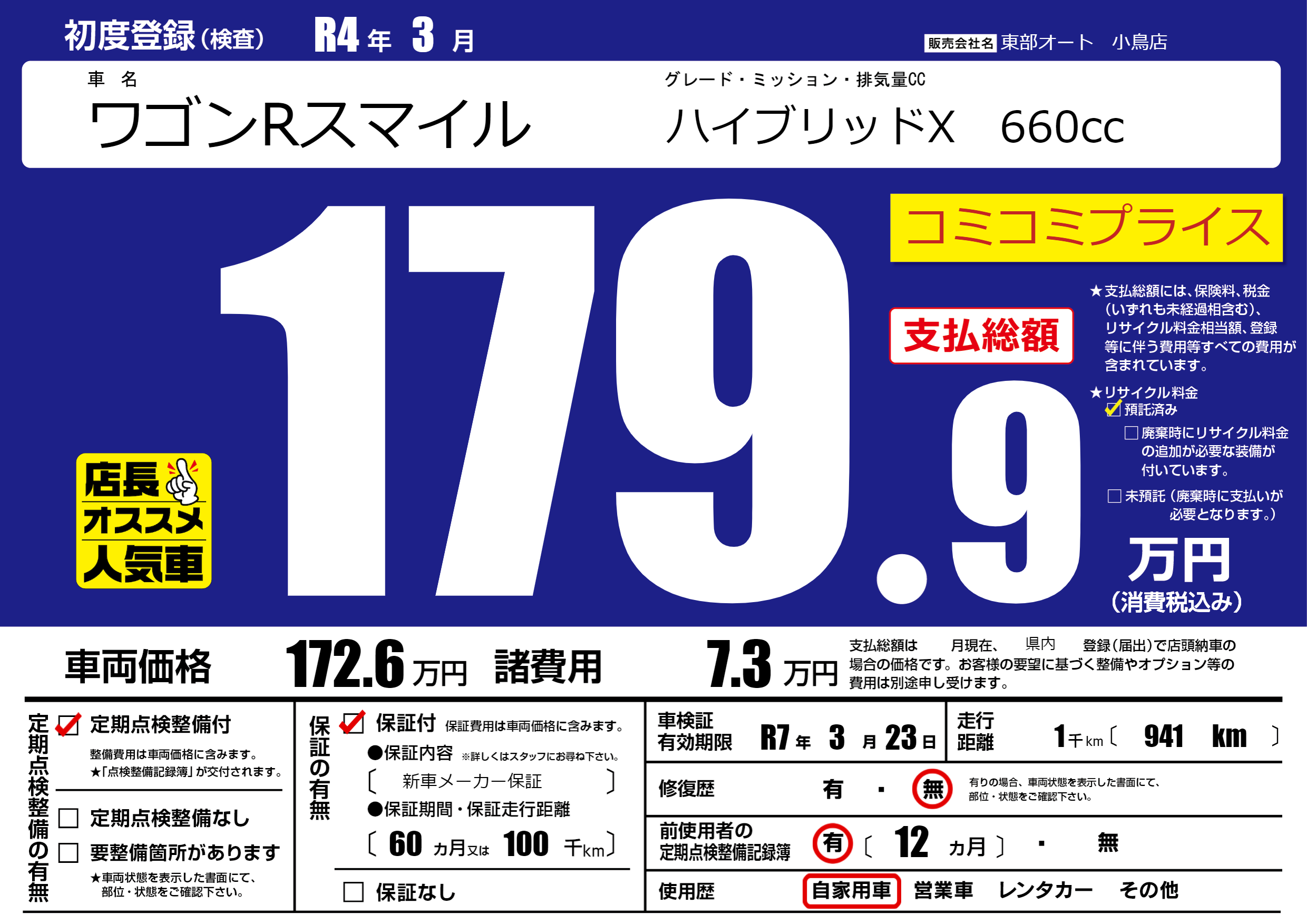 | 車名 | ワゴンRスマイル | グレード ミッション 排気量 |