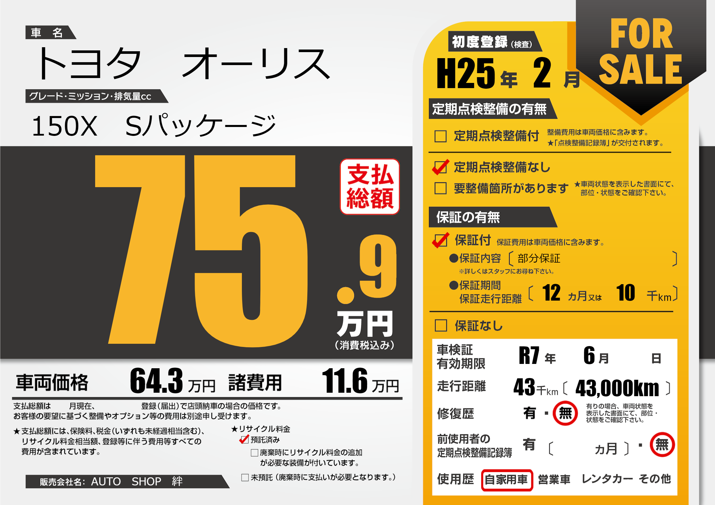 | 車名 | トヨタ オーリス | グレード ミッション 排気量 |