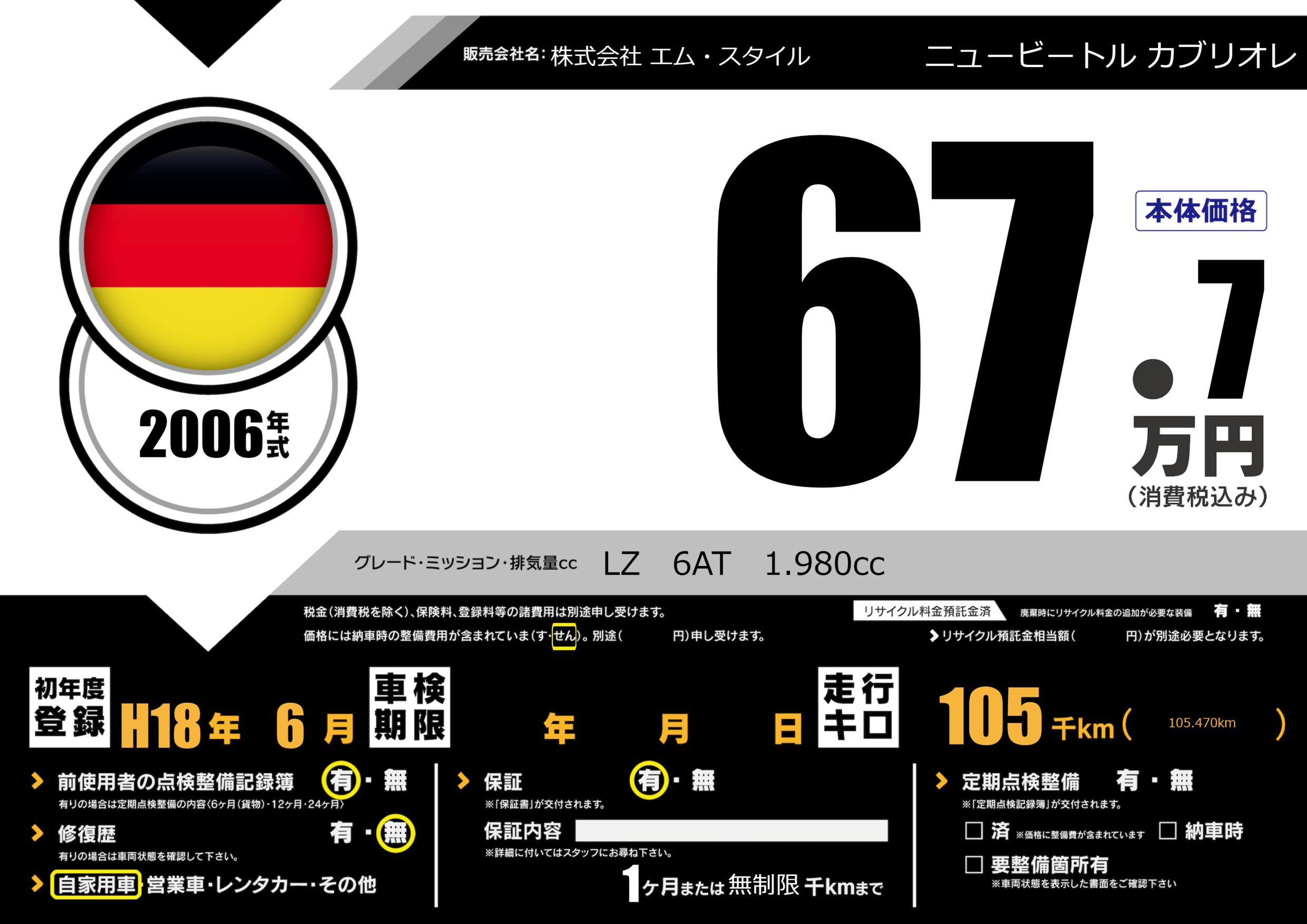 | 車名 | ニュービートル カブリオレ | グレード ミッション 排気量 |