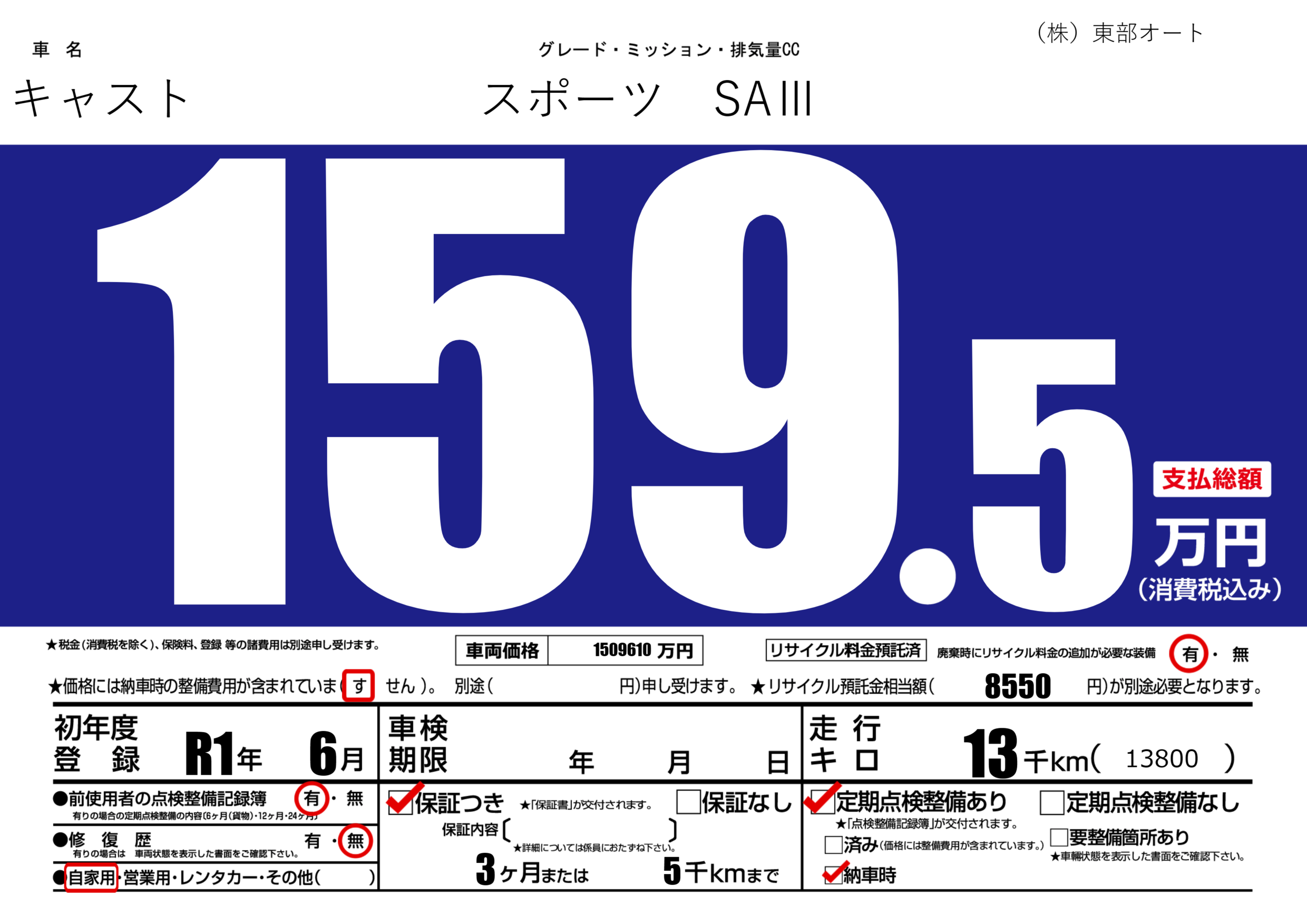 | 定期点検整備 | 定期点検整備あり 納車時あり | ||