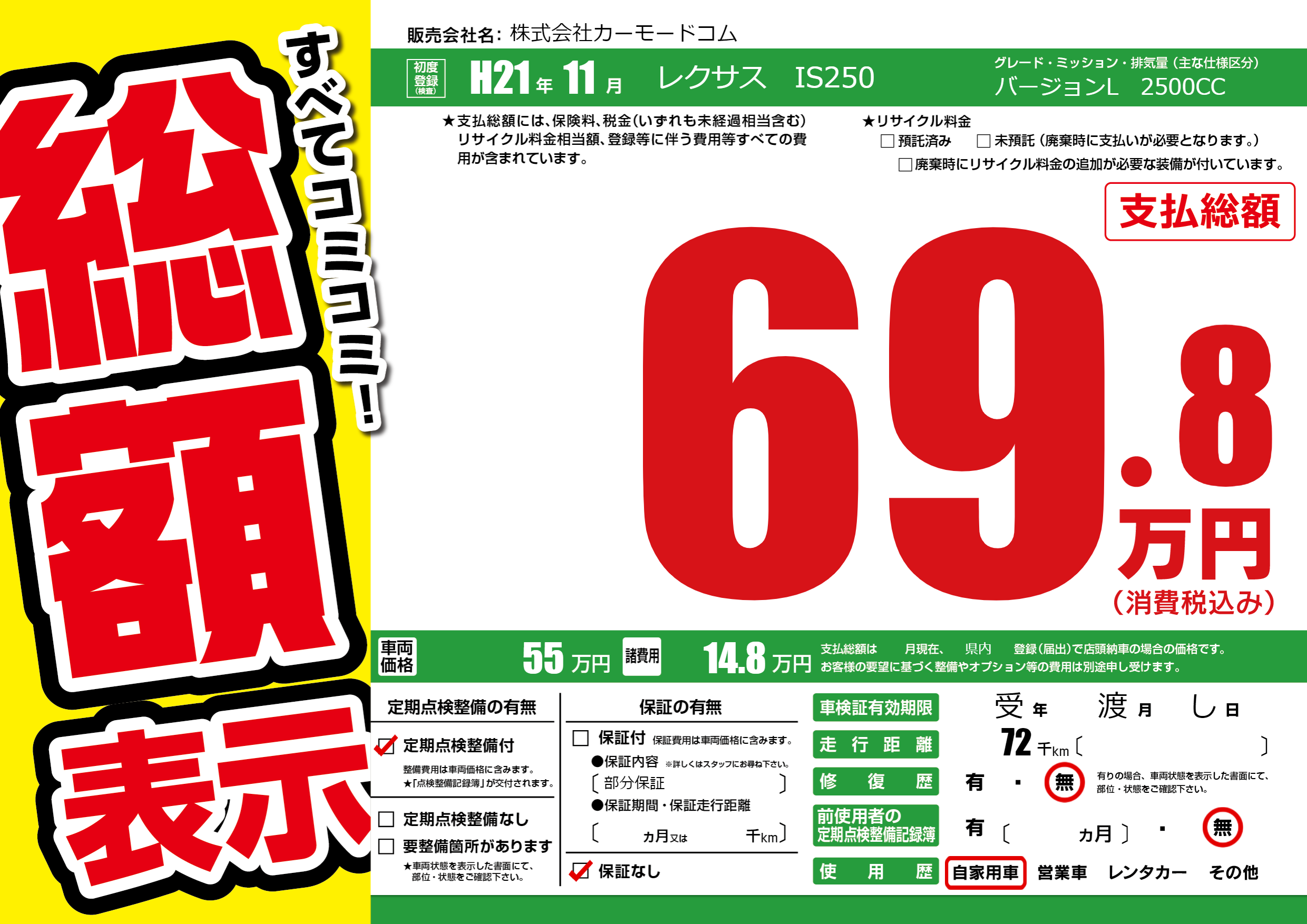| 走行キロ | 7.2万km | 初年度登録 | H21年11月 |