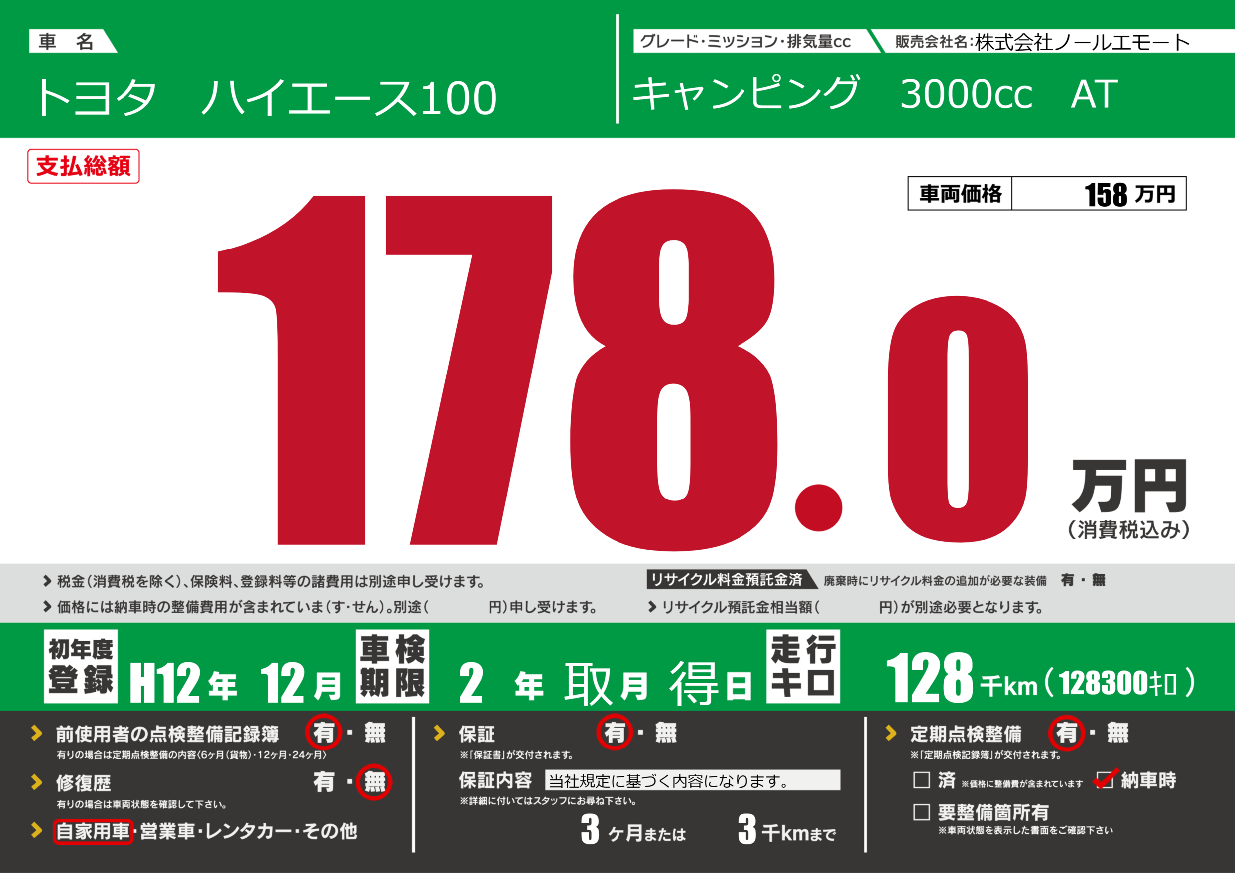 | 車名 | トヨタ ハイエース100 | グレード ミッション 排気量 |