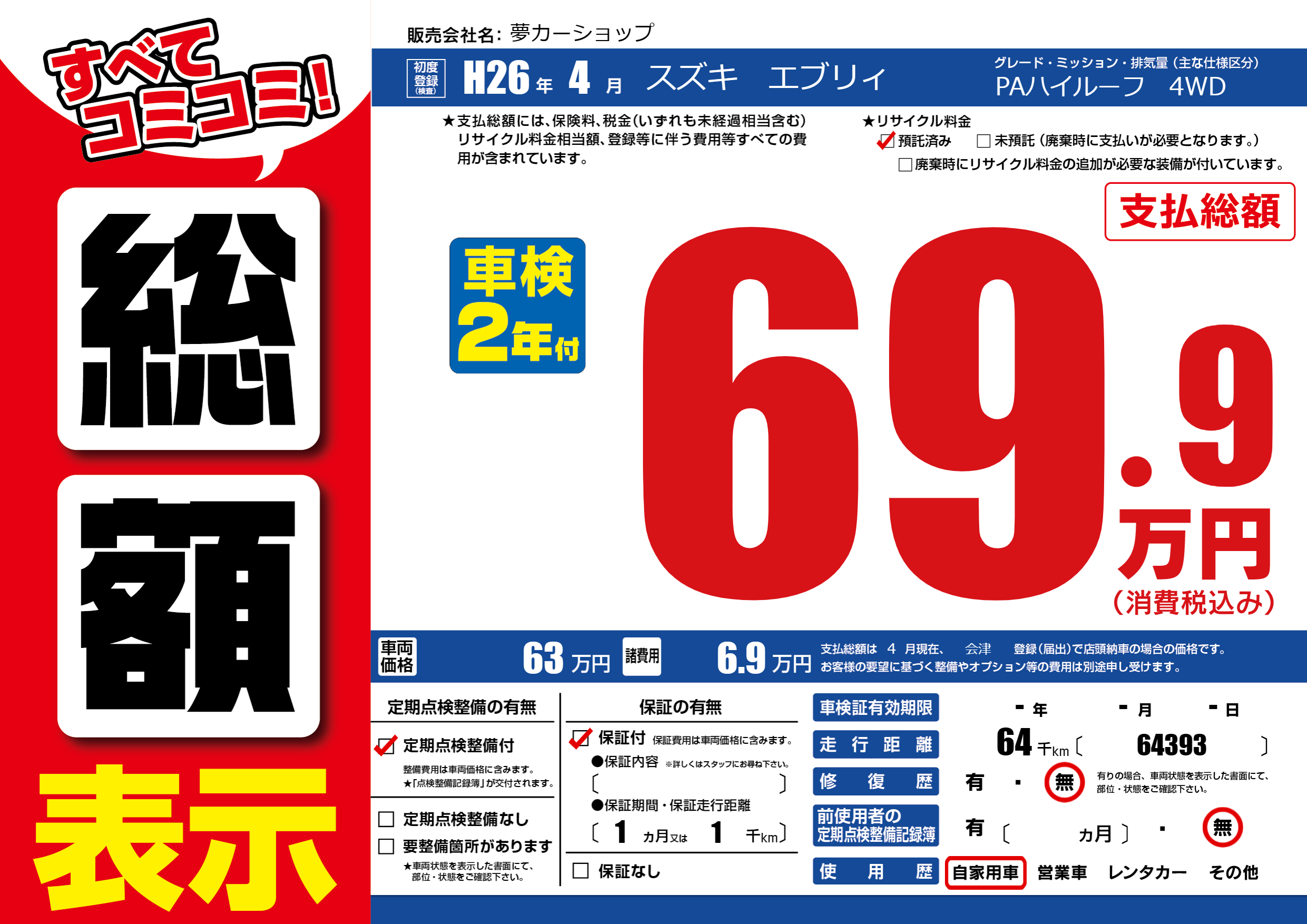 | 車名 | スズキ エブリィ | グレード ミッション 排気量 |