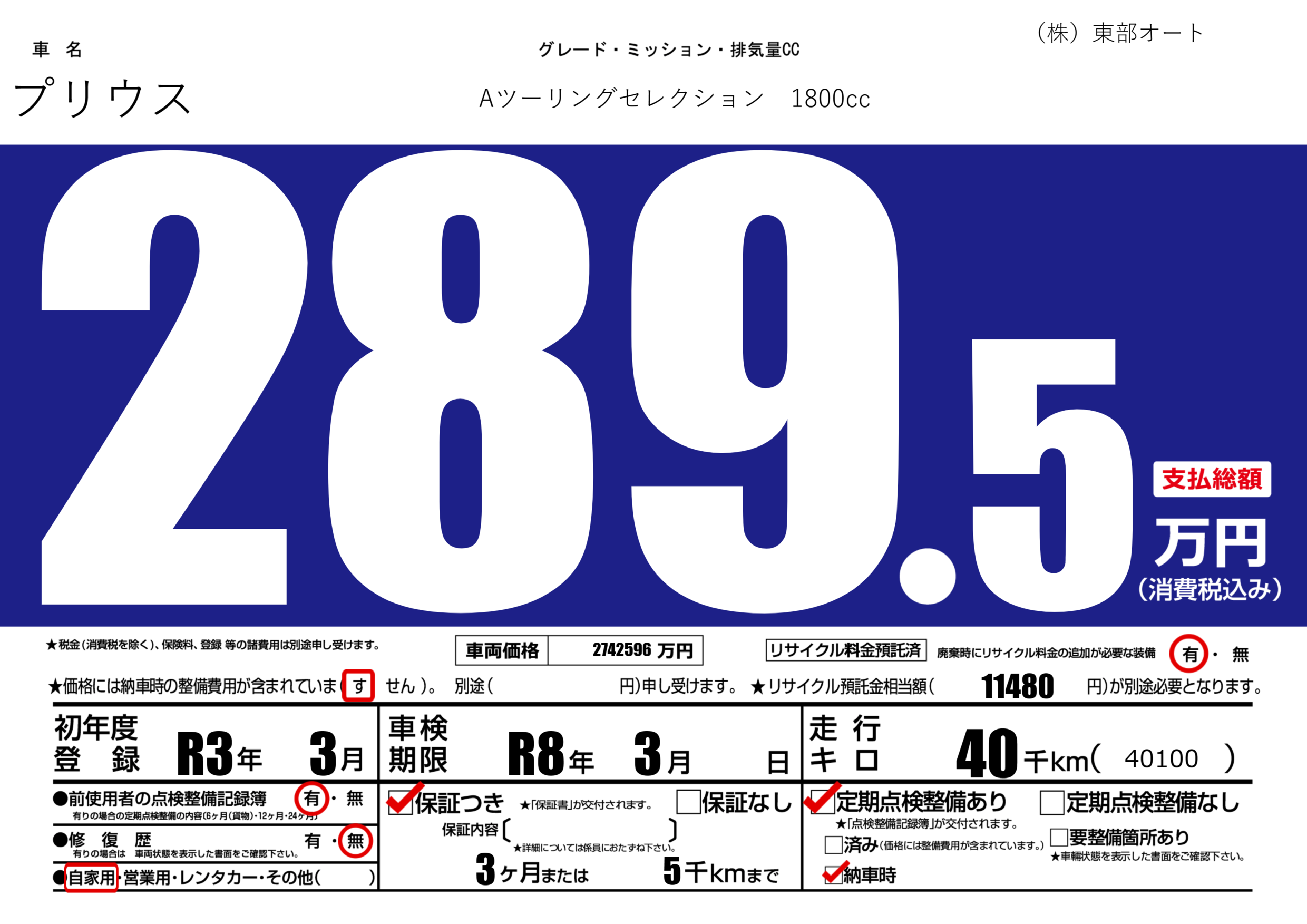 | 車名 | プリウス | グレード ミッション 排気量 |