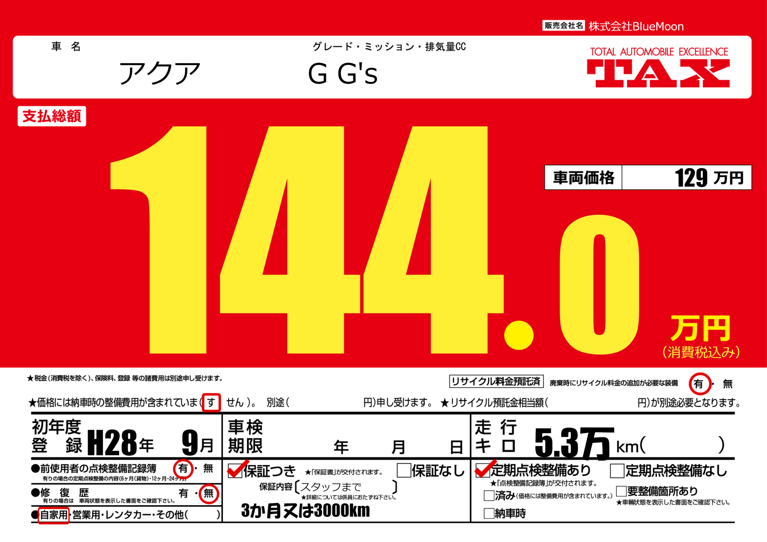 保証付き 保証内容(スタッフまで) ---ヶ月または()千kmまで |