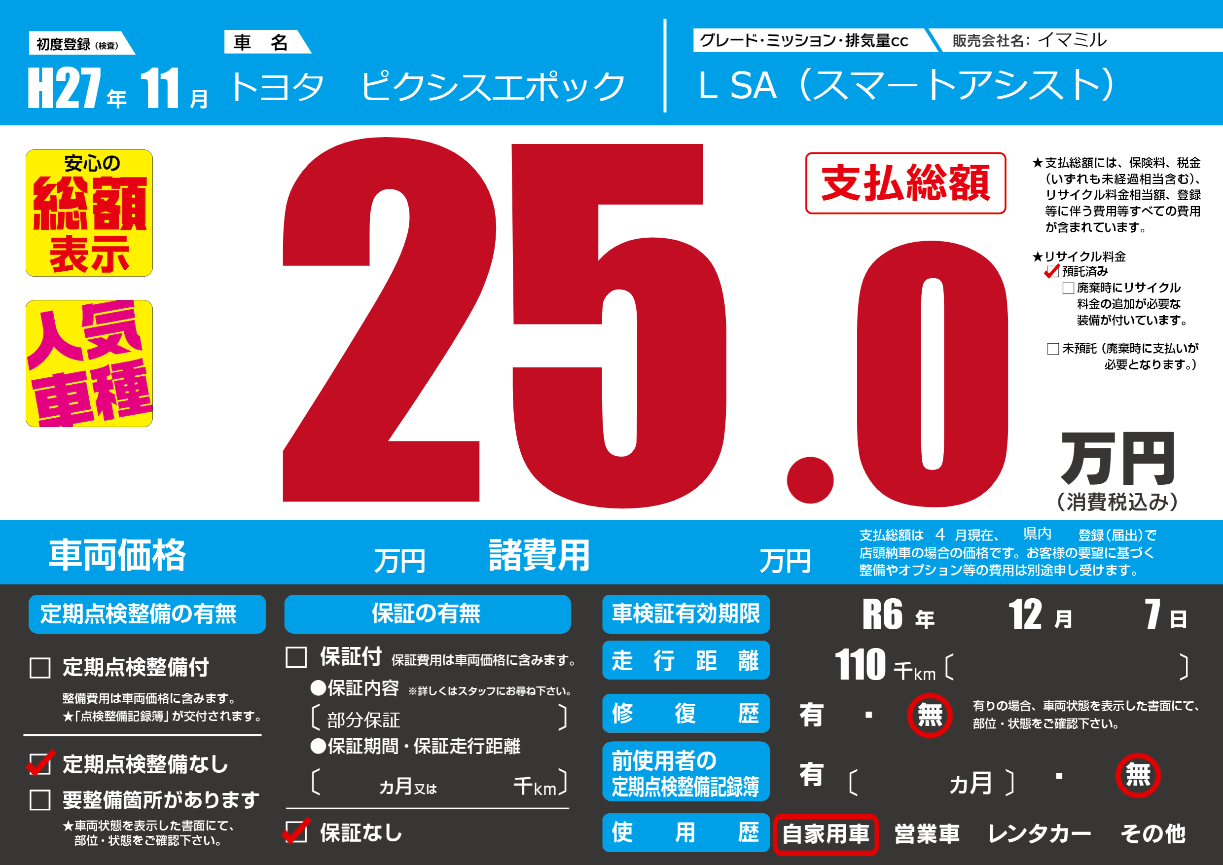 | 走行キロ | 11万km | 初年度登録 | H27年11月 |