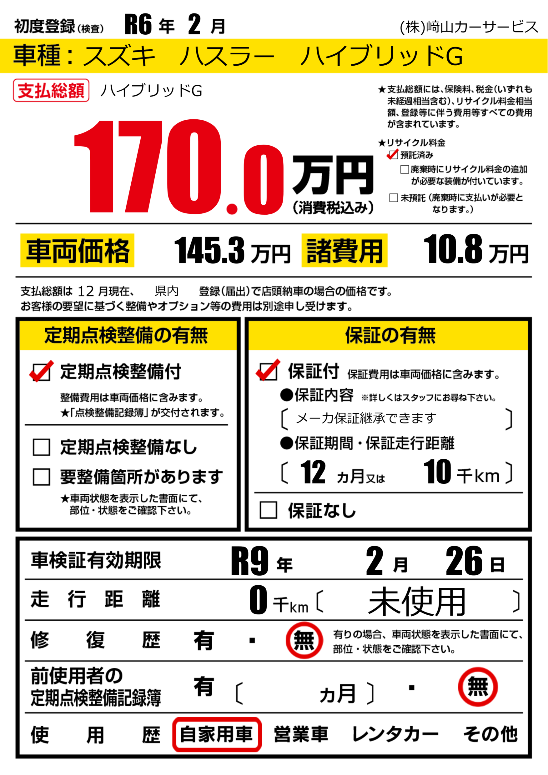 保証内容(メーカ保証継承できます) 12ヶ月または10千km