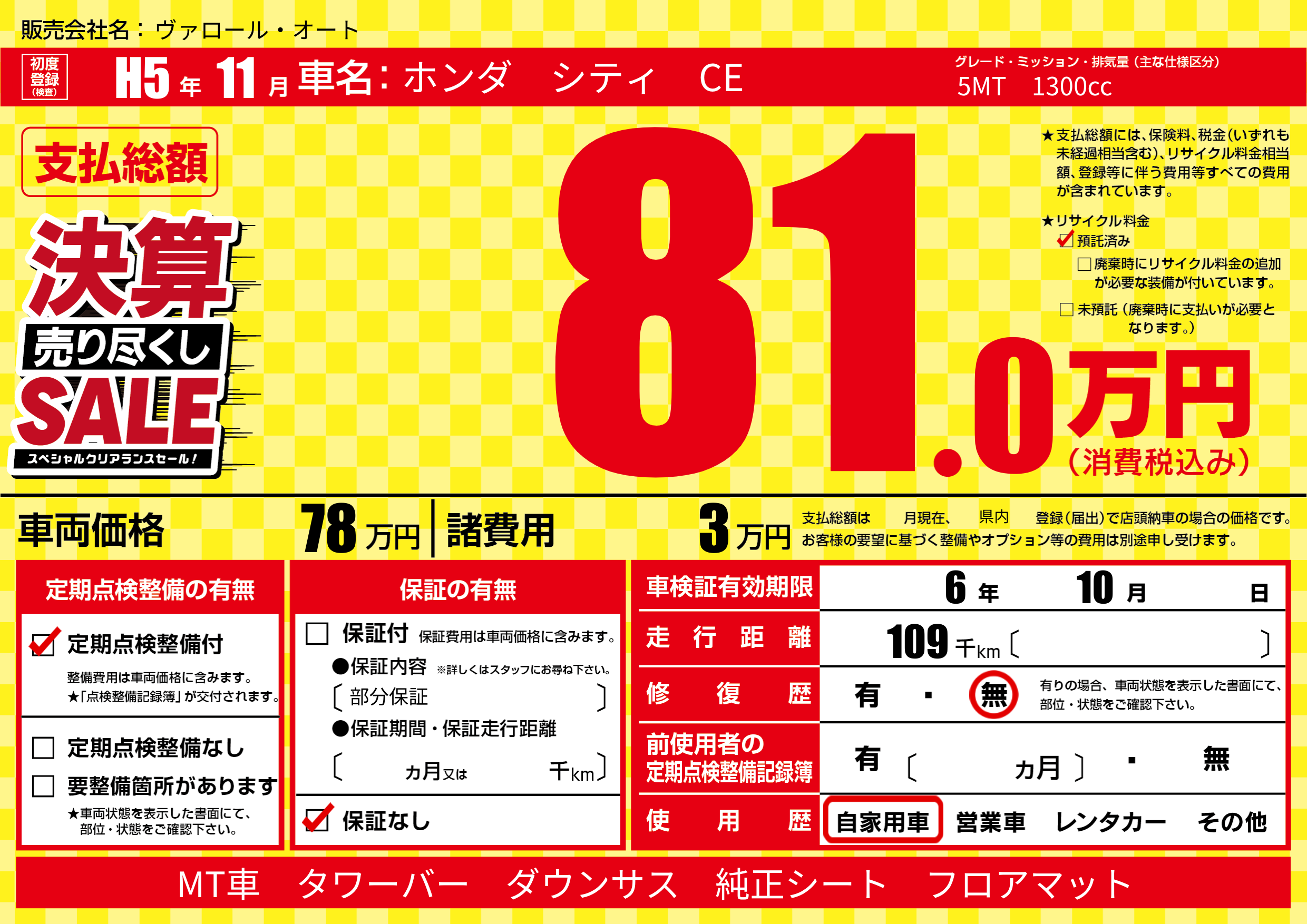 | 車名 | ホンダ シティ CE | グレード ミッション 排気量 |
