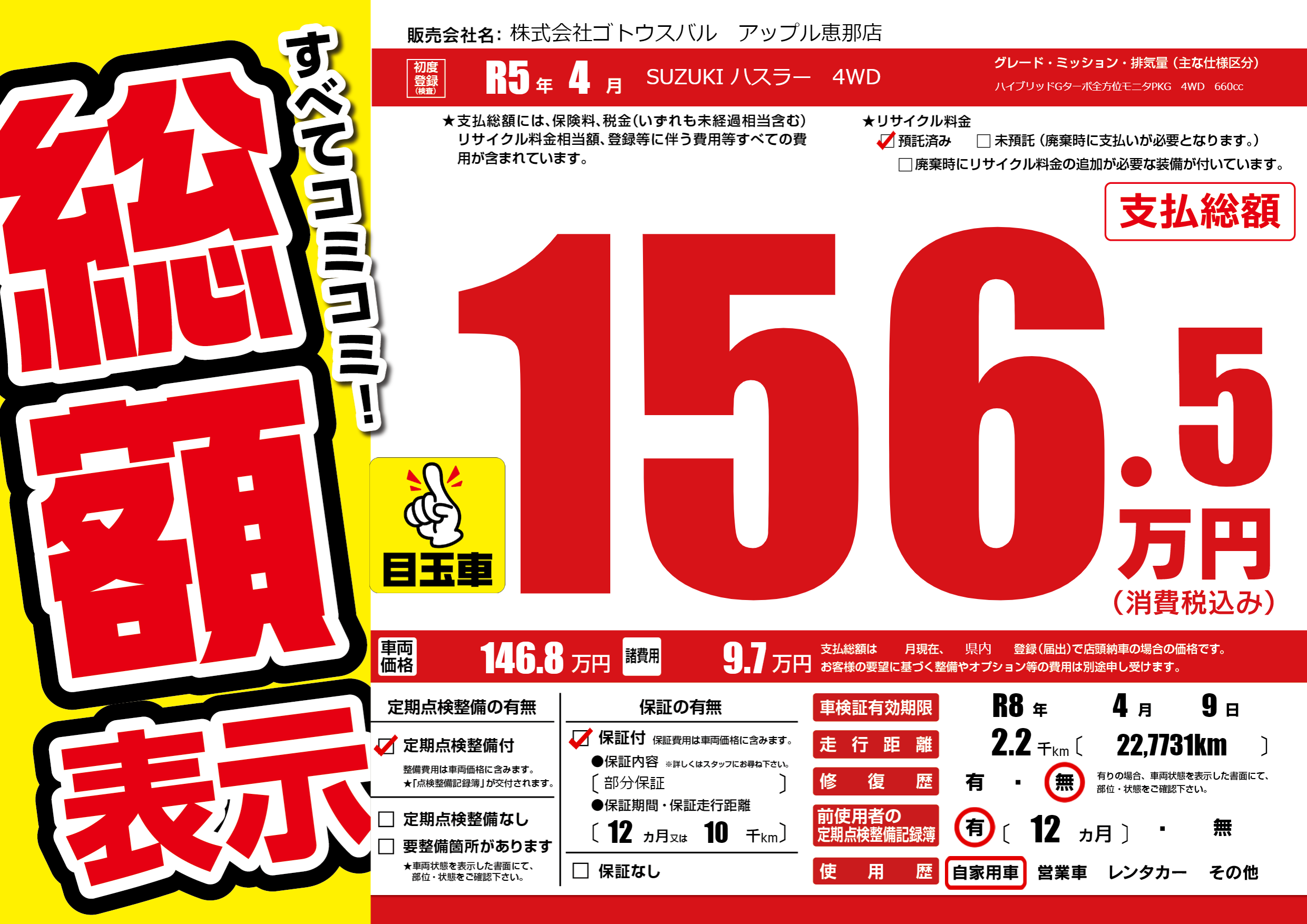 | 車名 | SUZUKI ハスラー 4WD | グレード ミッション 排気量 |