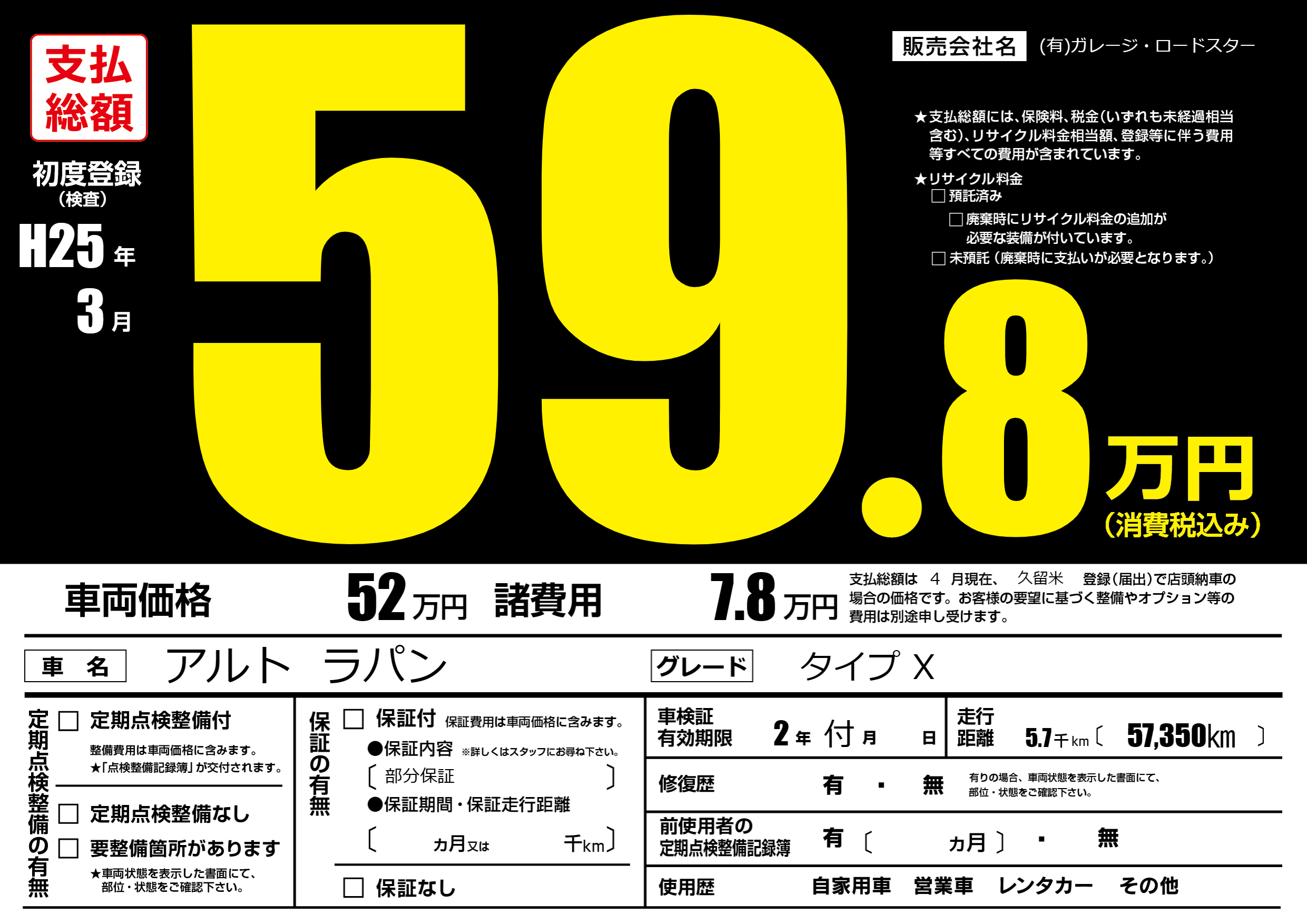 | 走行キロ | 0.5万km | 初年度登録 | H25年3月 |