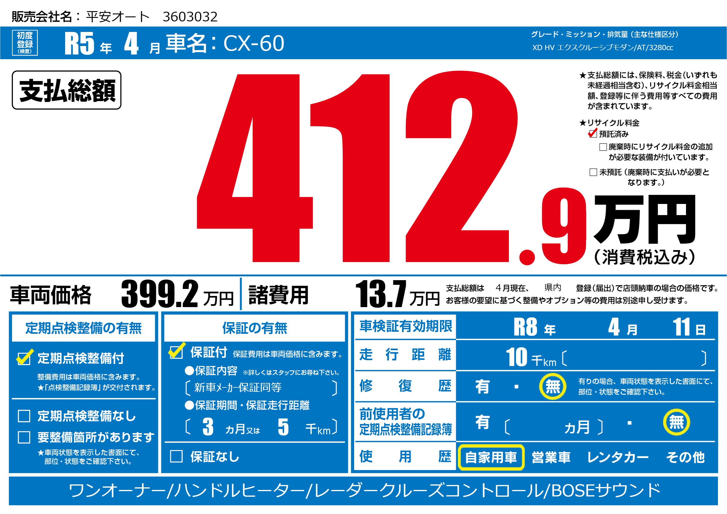 | 車名 | CX-60 | グレード ミッション 排気量 |