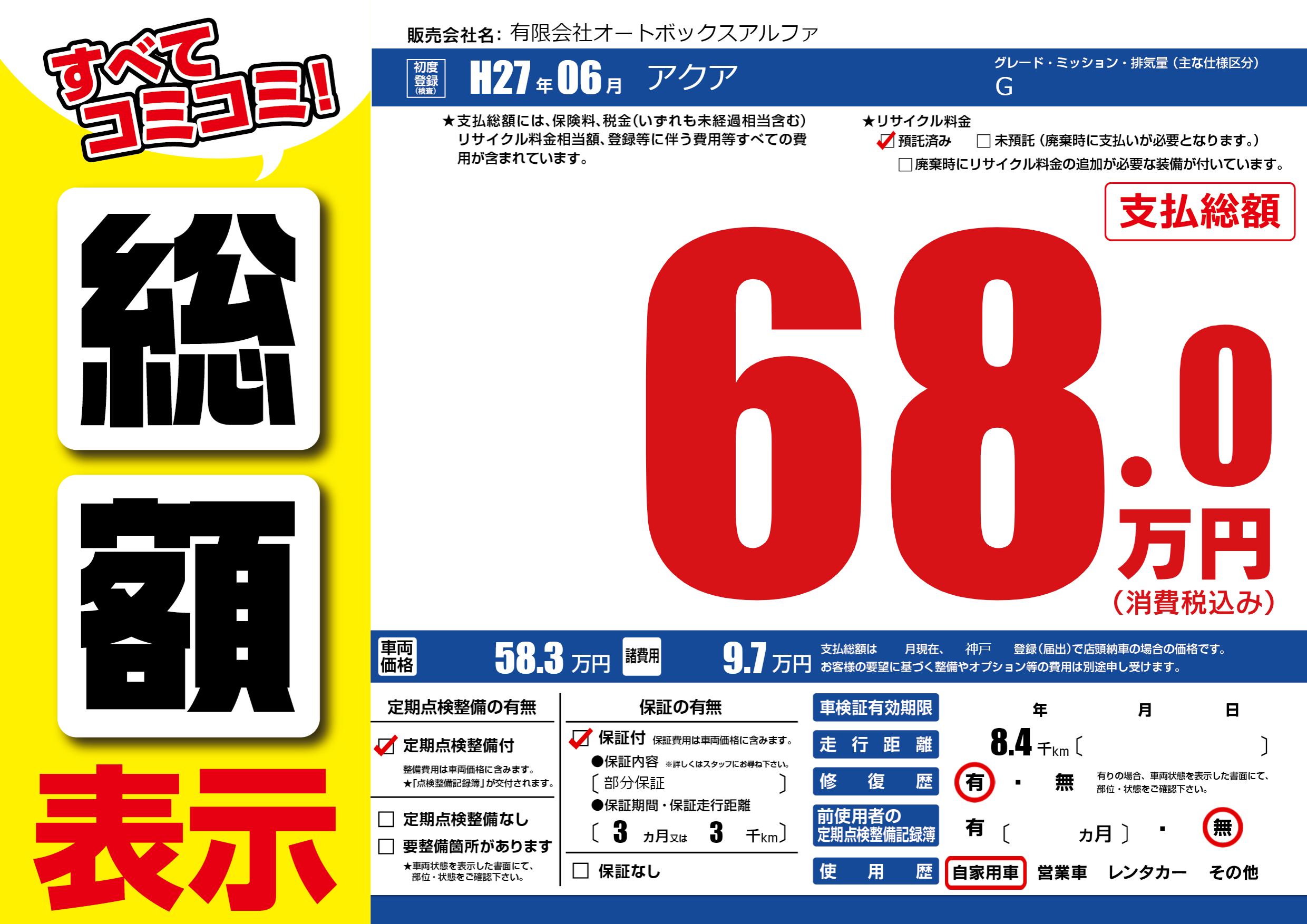 | 走行キロ | 0.8万km | 初年度登録 | H27年06月 |