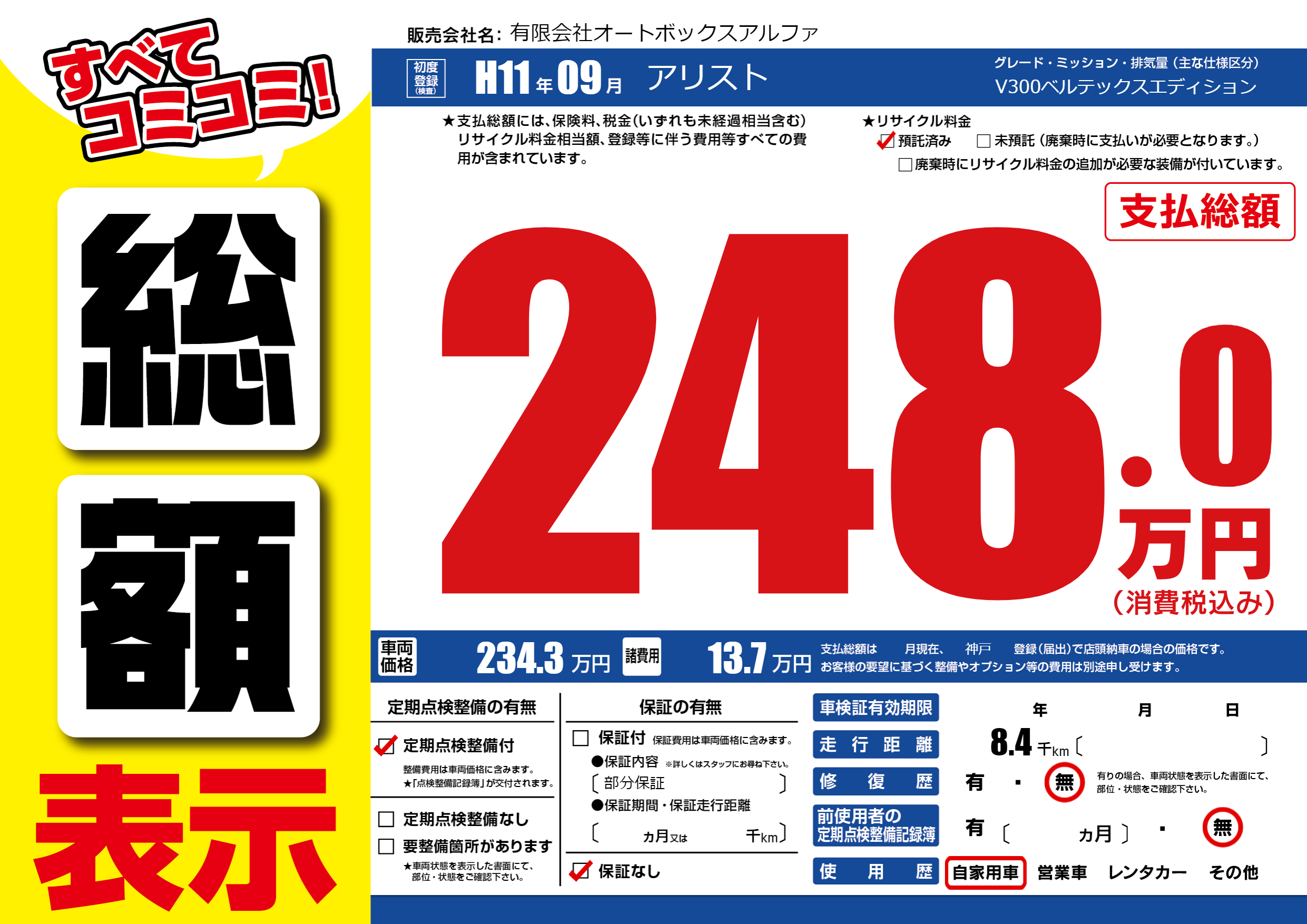 | 走行キロ | 0.8万km | 初年度登録 | H11年09月 |