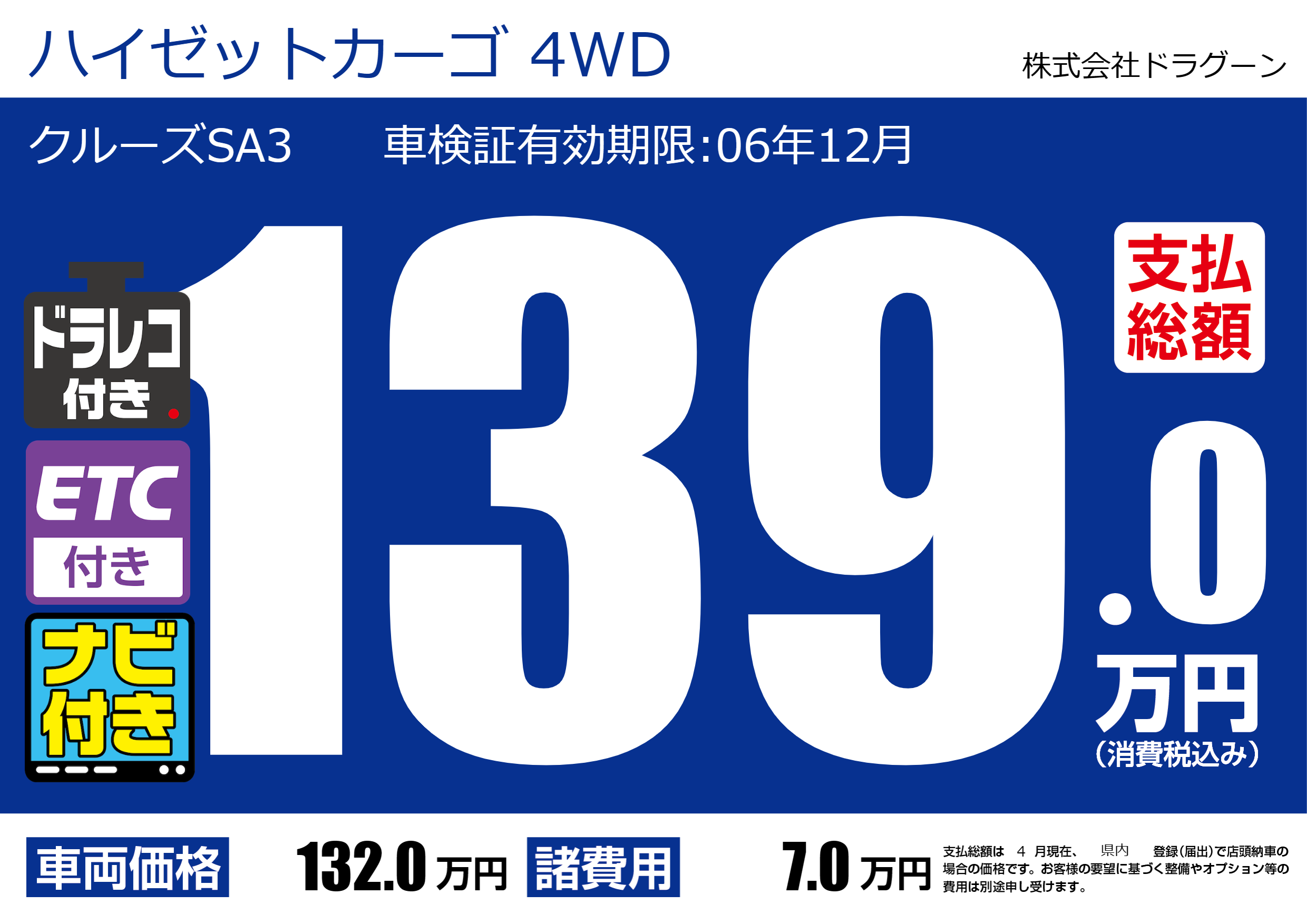| 車名 | ハイゼットカーゴ 4WD | グレード ミッション 排気量 |
