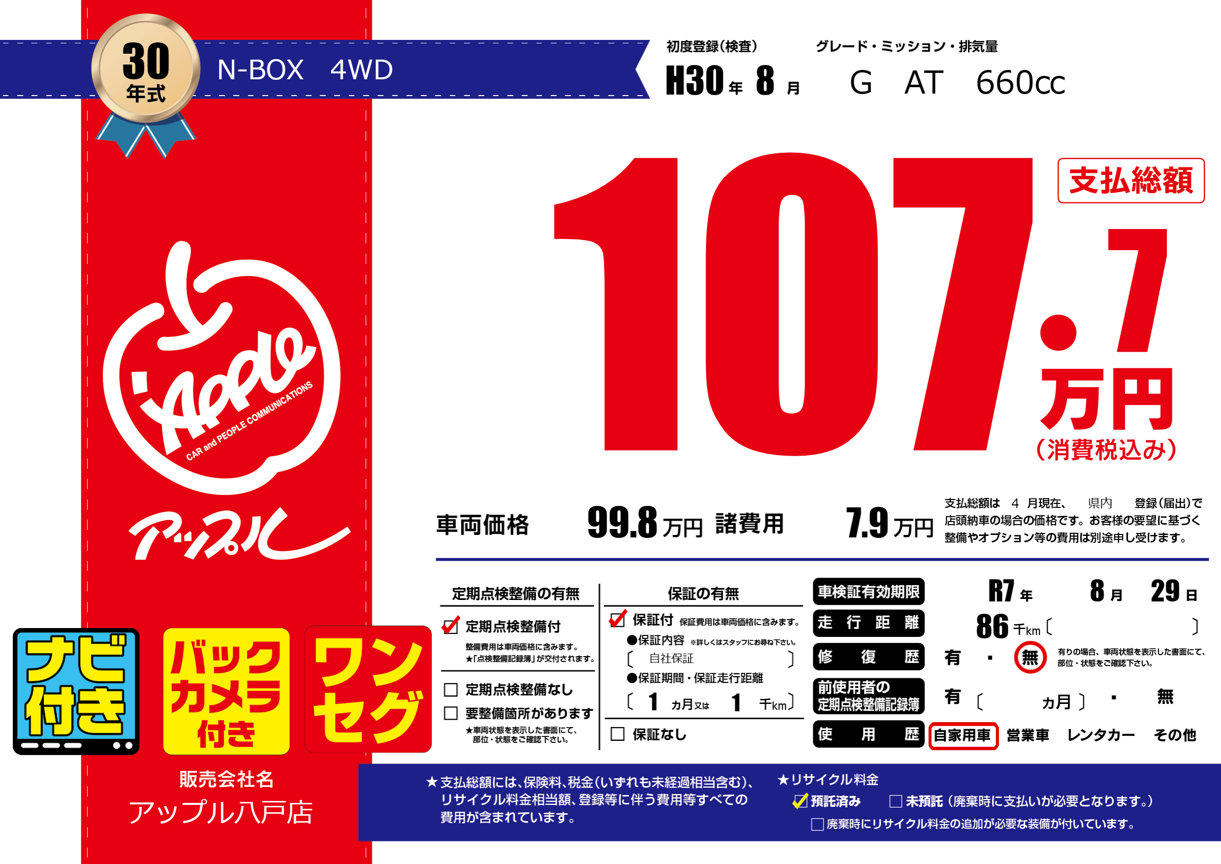 なし | 車検制限 | R7年8月29月 |