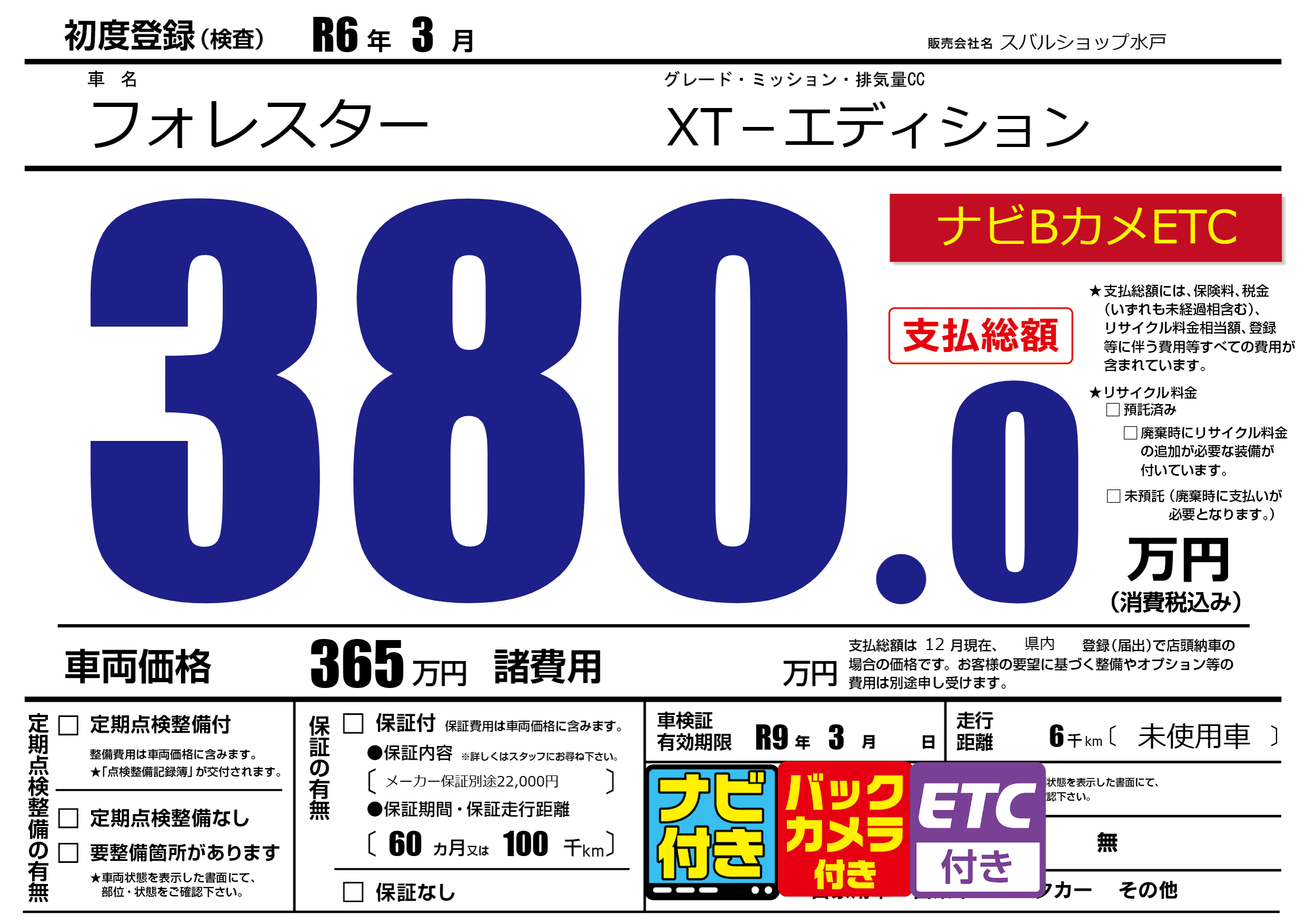 | 車名 | フォレスター | グレード ミッション 排気量 |