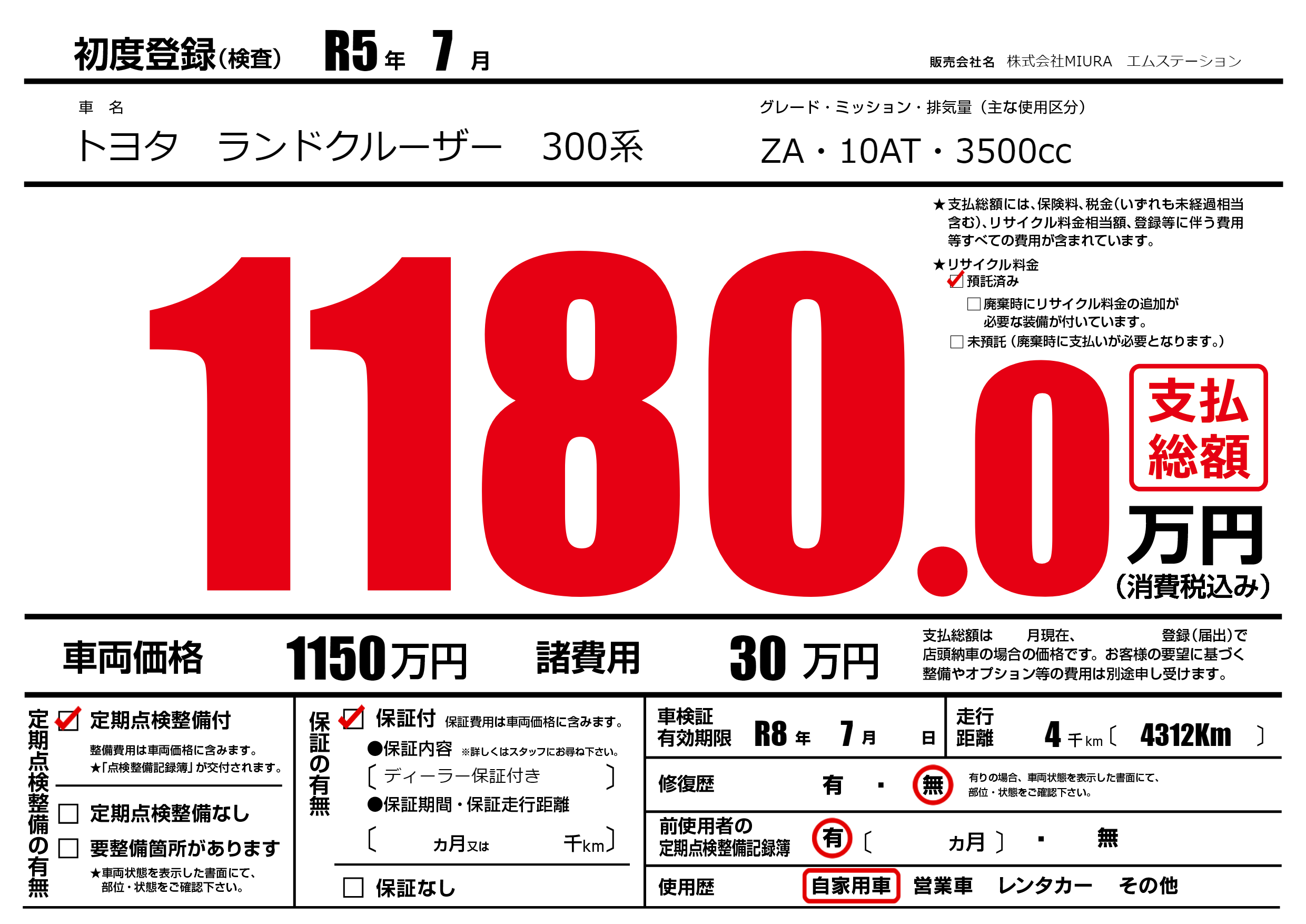 | 車名 | トヨタ ランドクルーザー 300系 | グレード ミッション 排気量 |