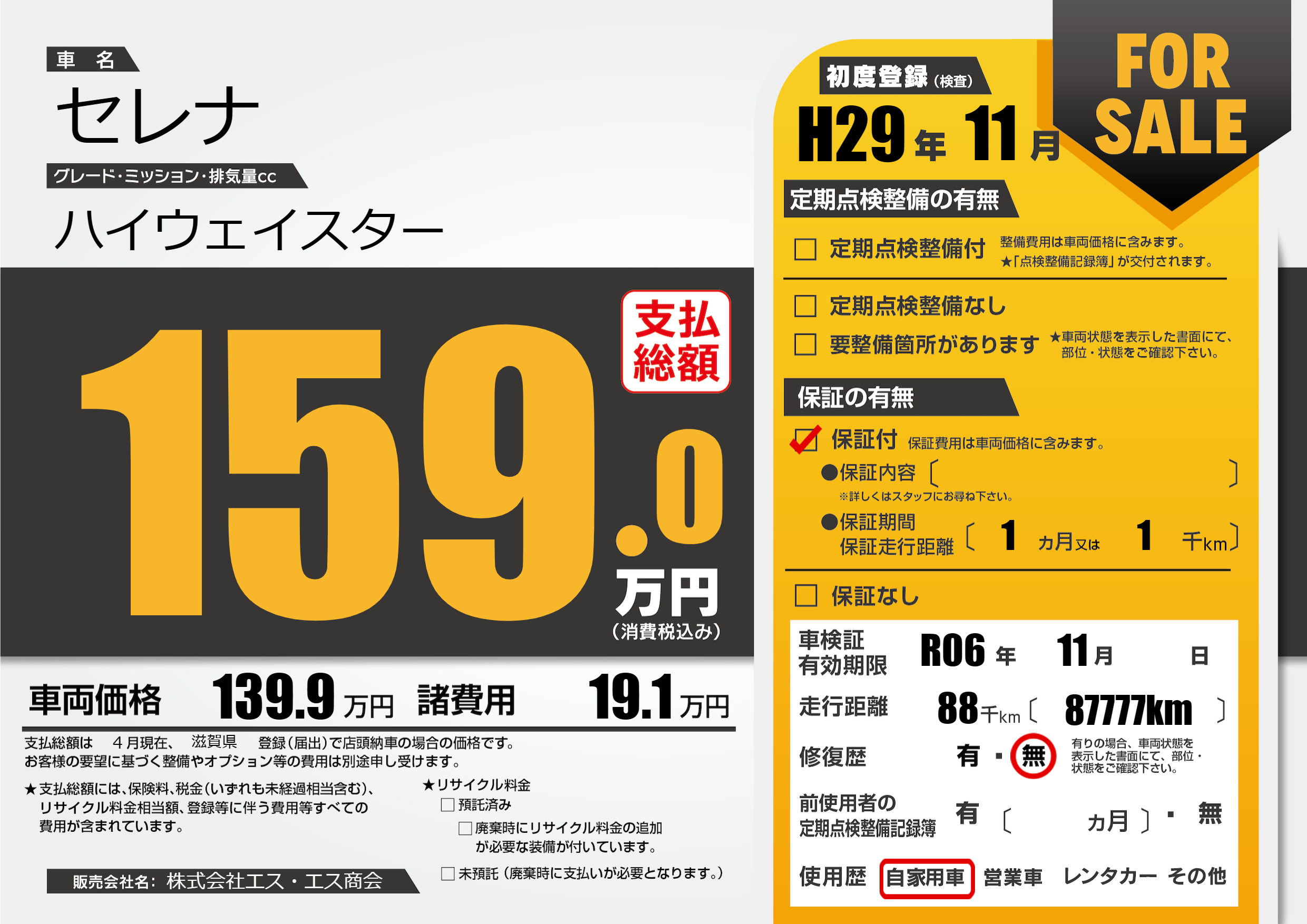 | 走行キロ | 8.8万km | 初年度登録 | H29年11月 |