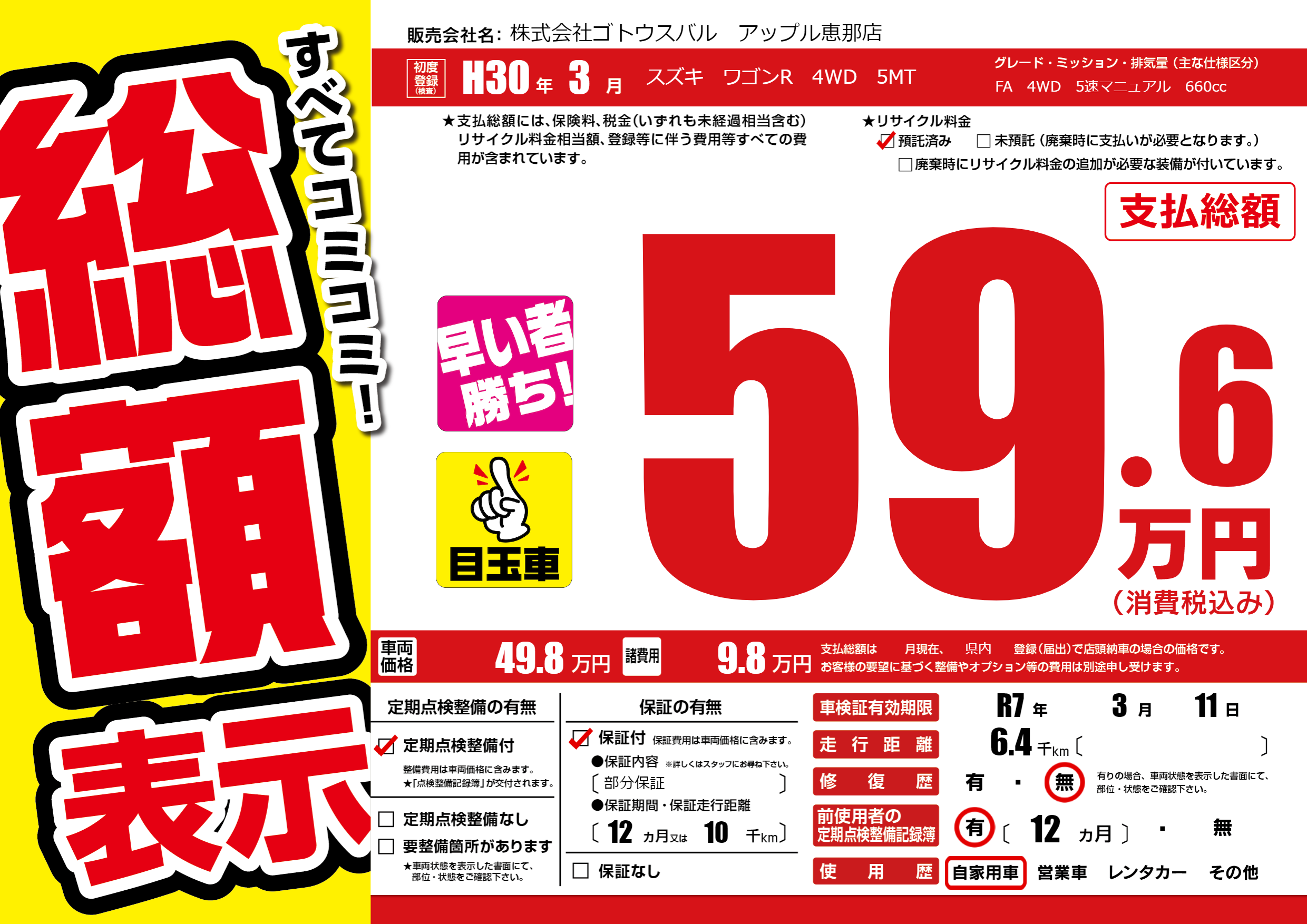 | 車名 | スズキ ワゴンR 4WD 5MT | グレード ミッション 排気量 |