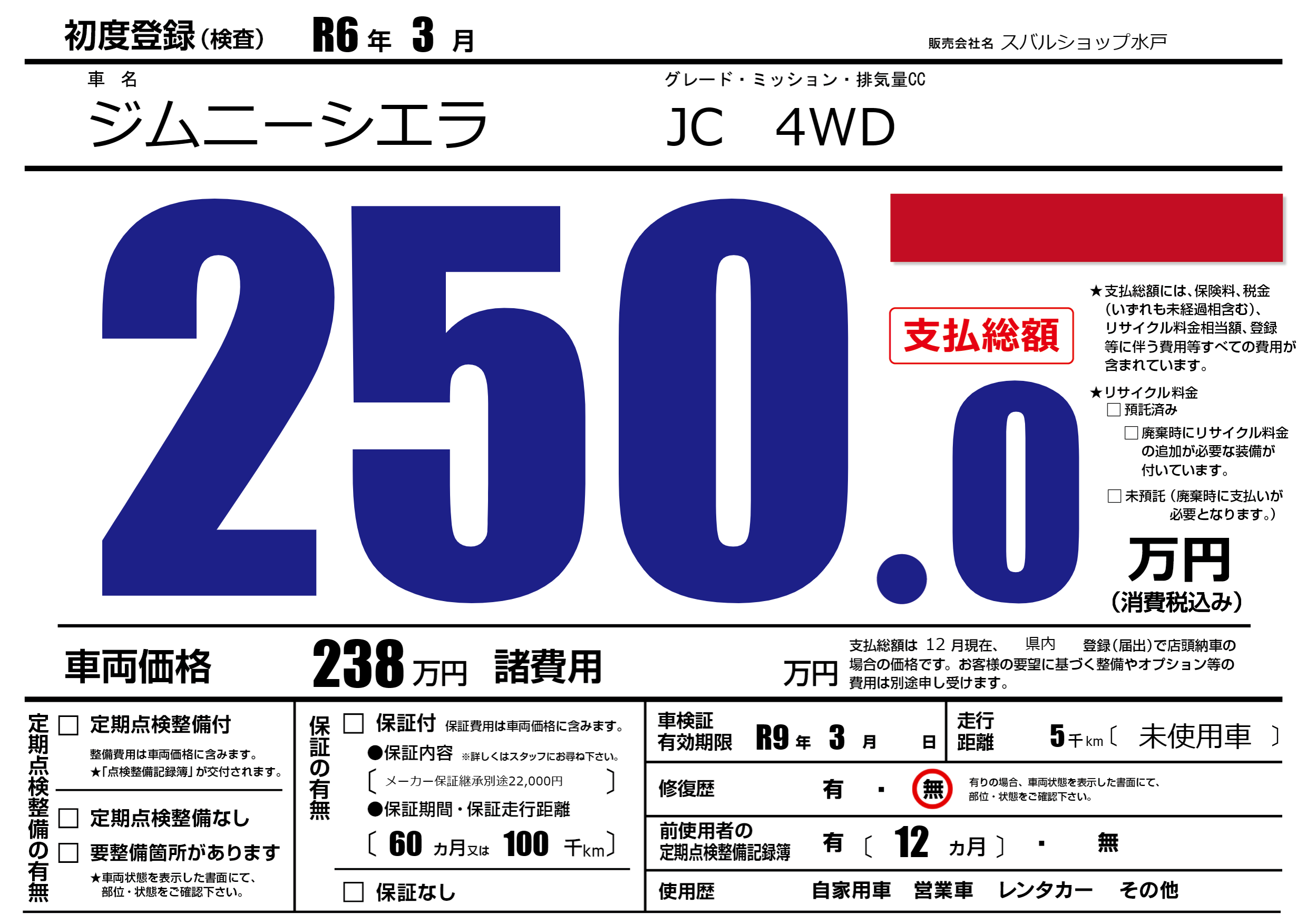 | 車名 | ジムニーシエラ | グレード ミッション 排気量 |