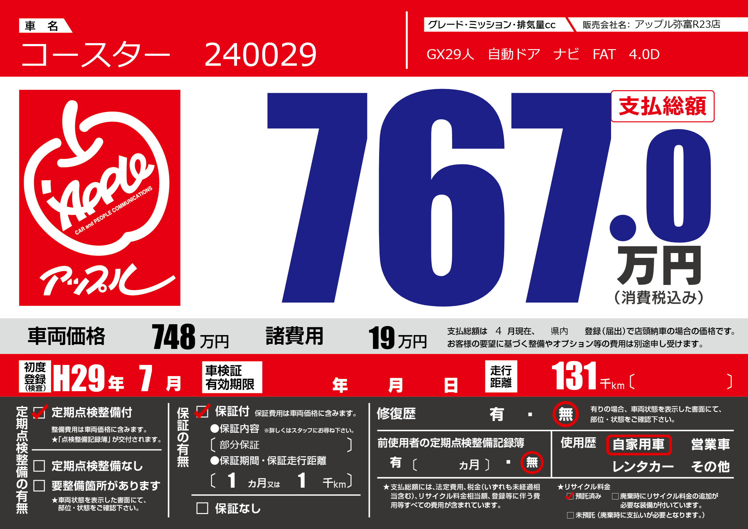 | 走行キロ | 13.1万km | 初年度登録 | H29年7月 |