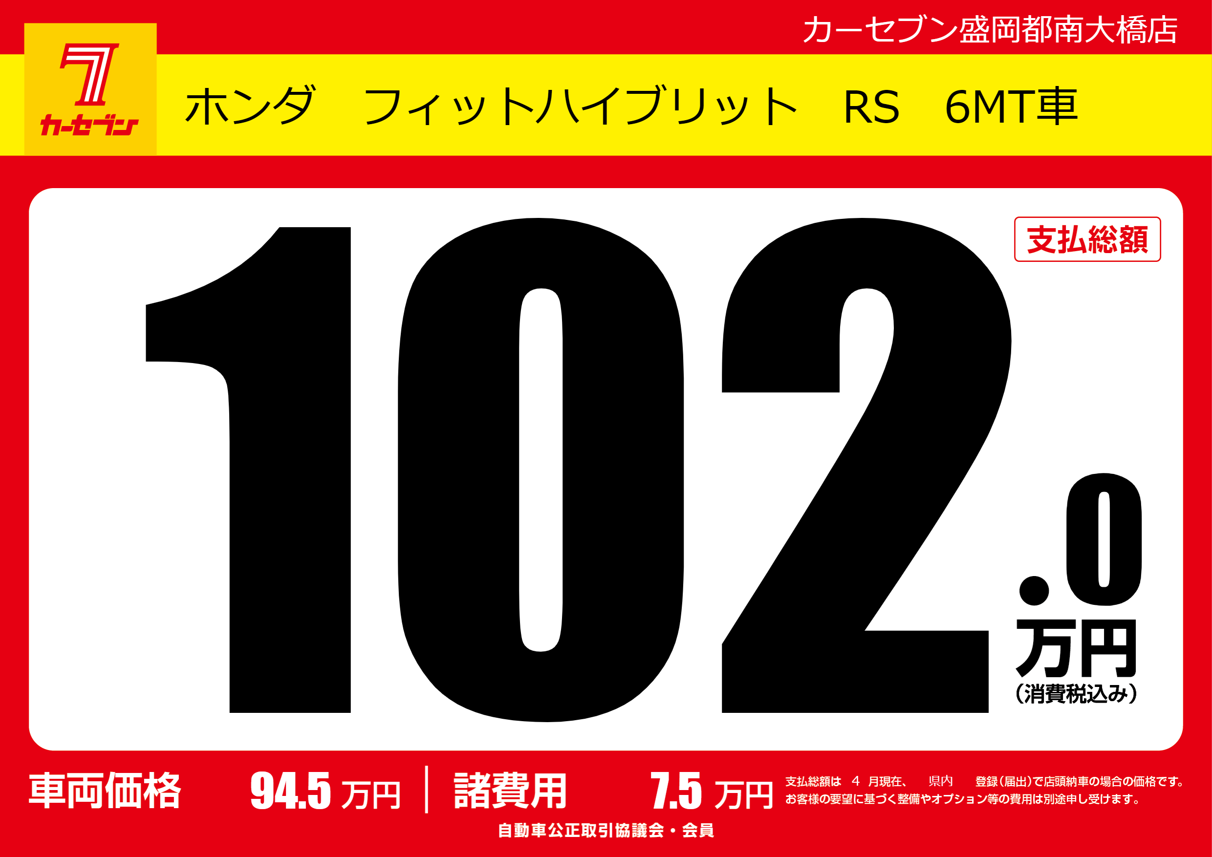 | 車名 | ホンダ フィットハイブリット RS 6MT車 | グレード ミッション 排気量 |