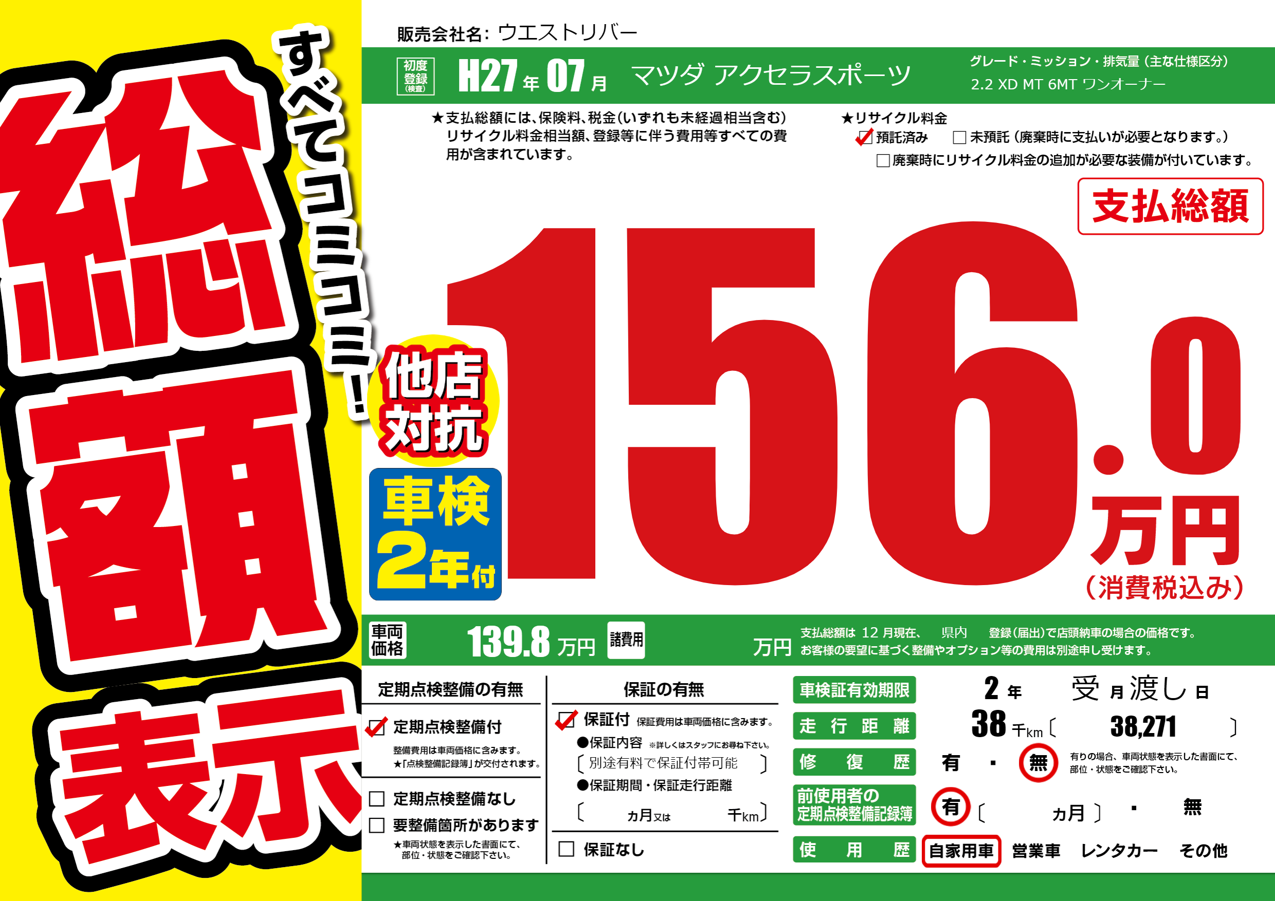 | 走行キロ | 3.8万km | 初年度登録 | H27年07月 |