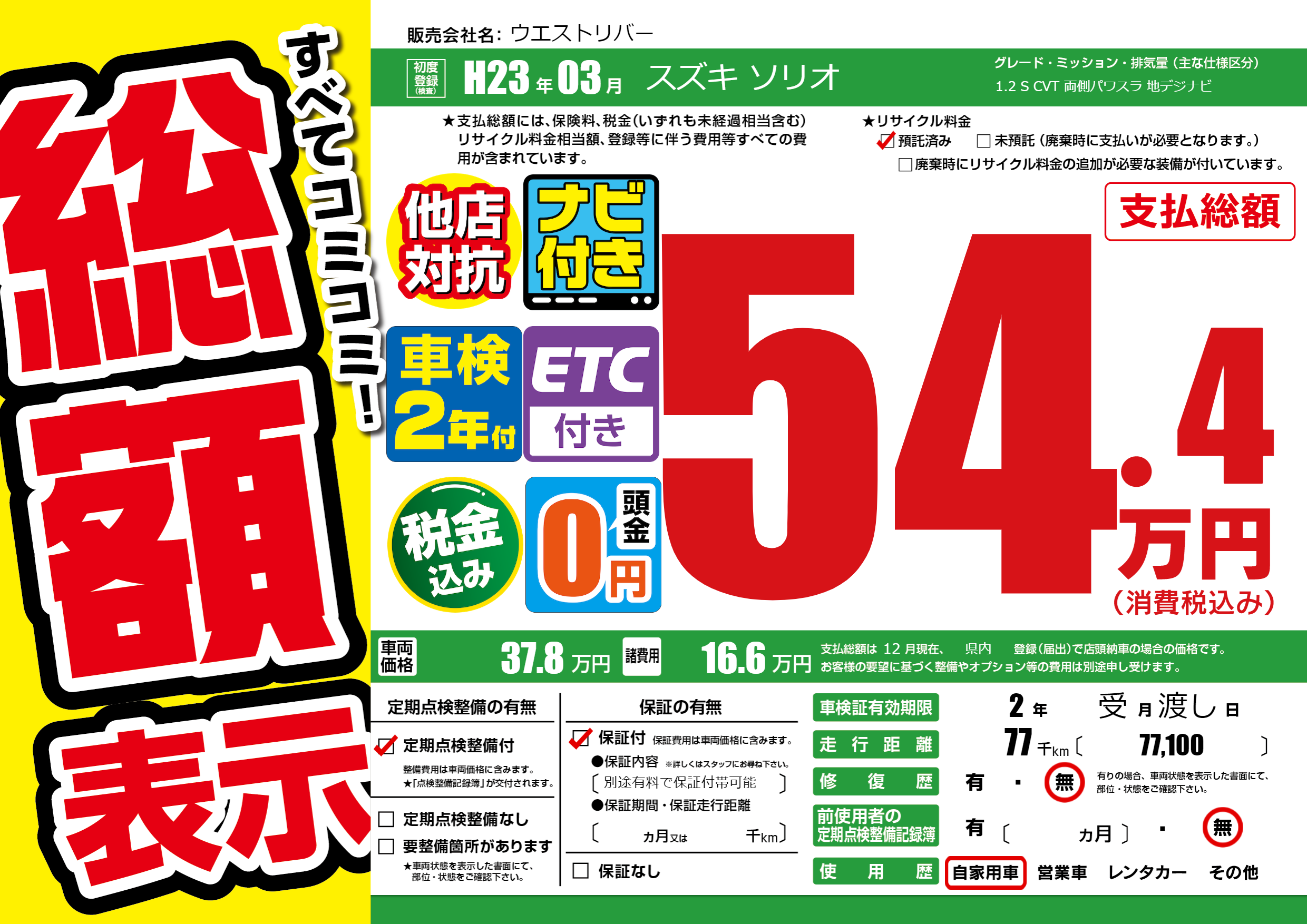 | 走行キロ | 7.7万km | 初年度登録 | H23年03月 |