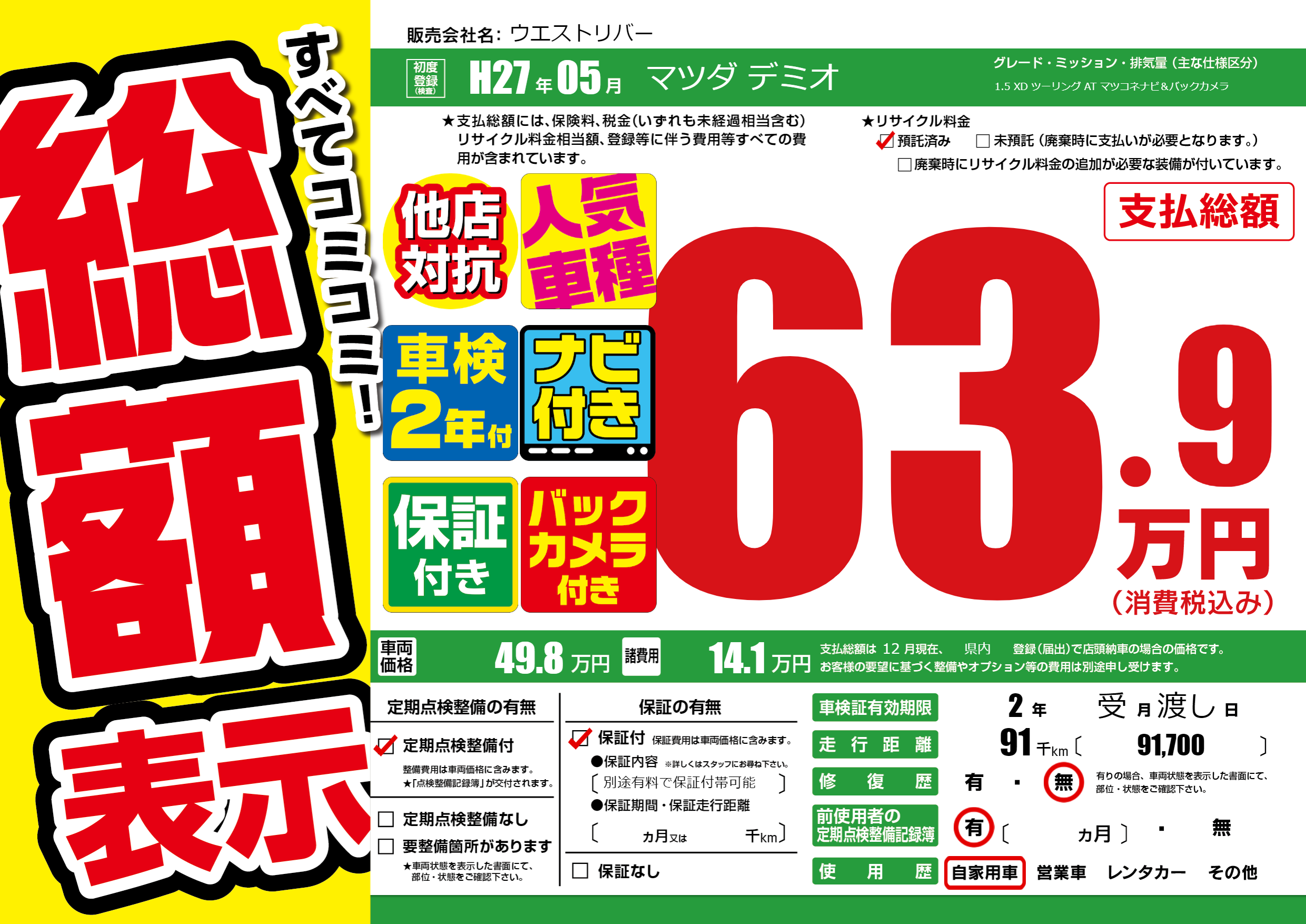 | 走行キロ | 9.1万km | 初年度登録 | H27年05月 |