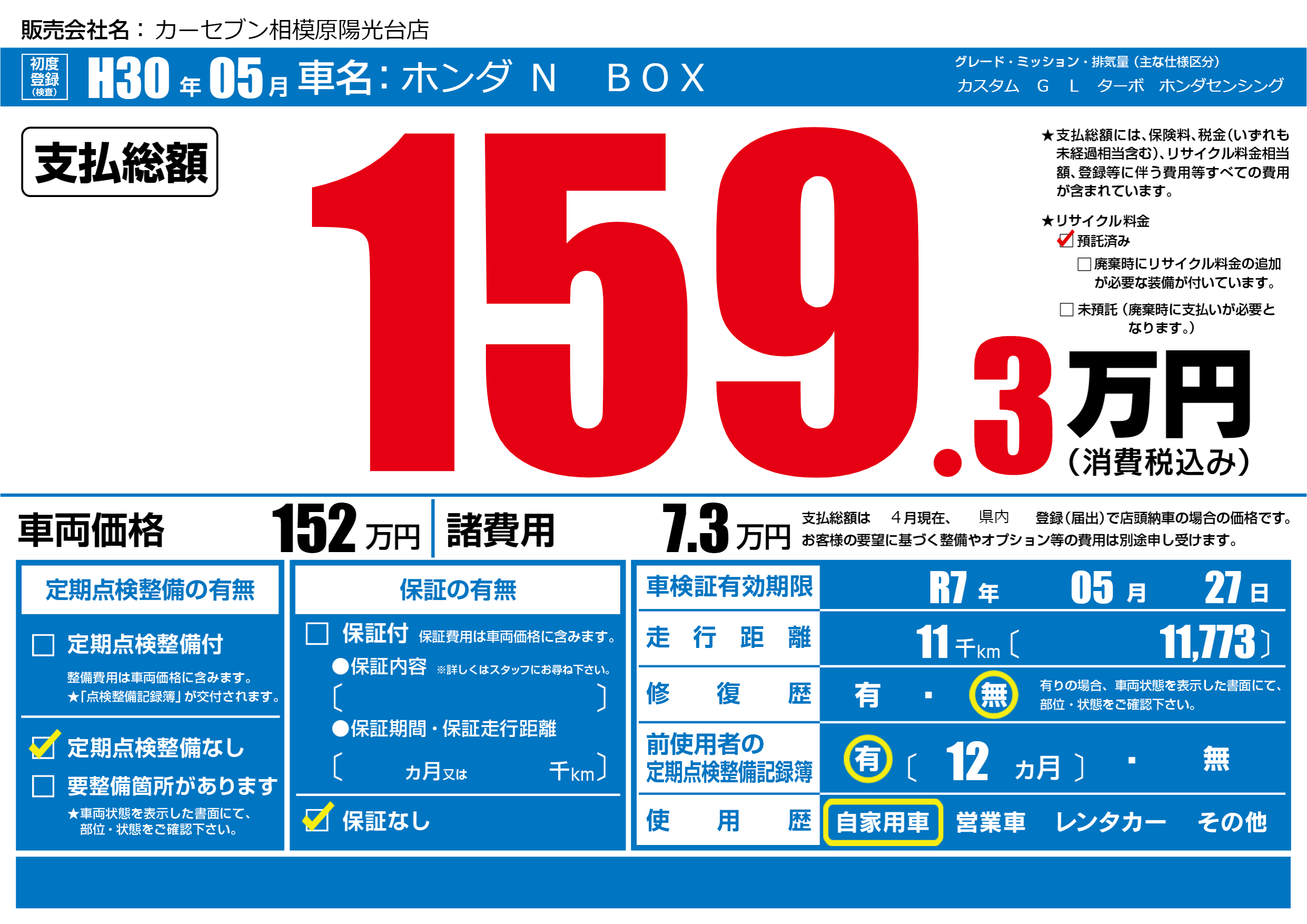 | 車名 | ホンダ N BOX | グレード ミッション 排気量 |