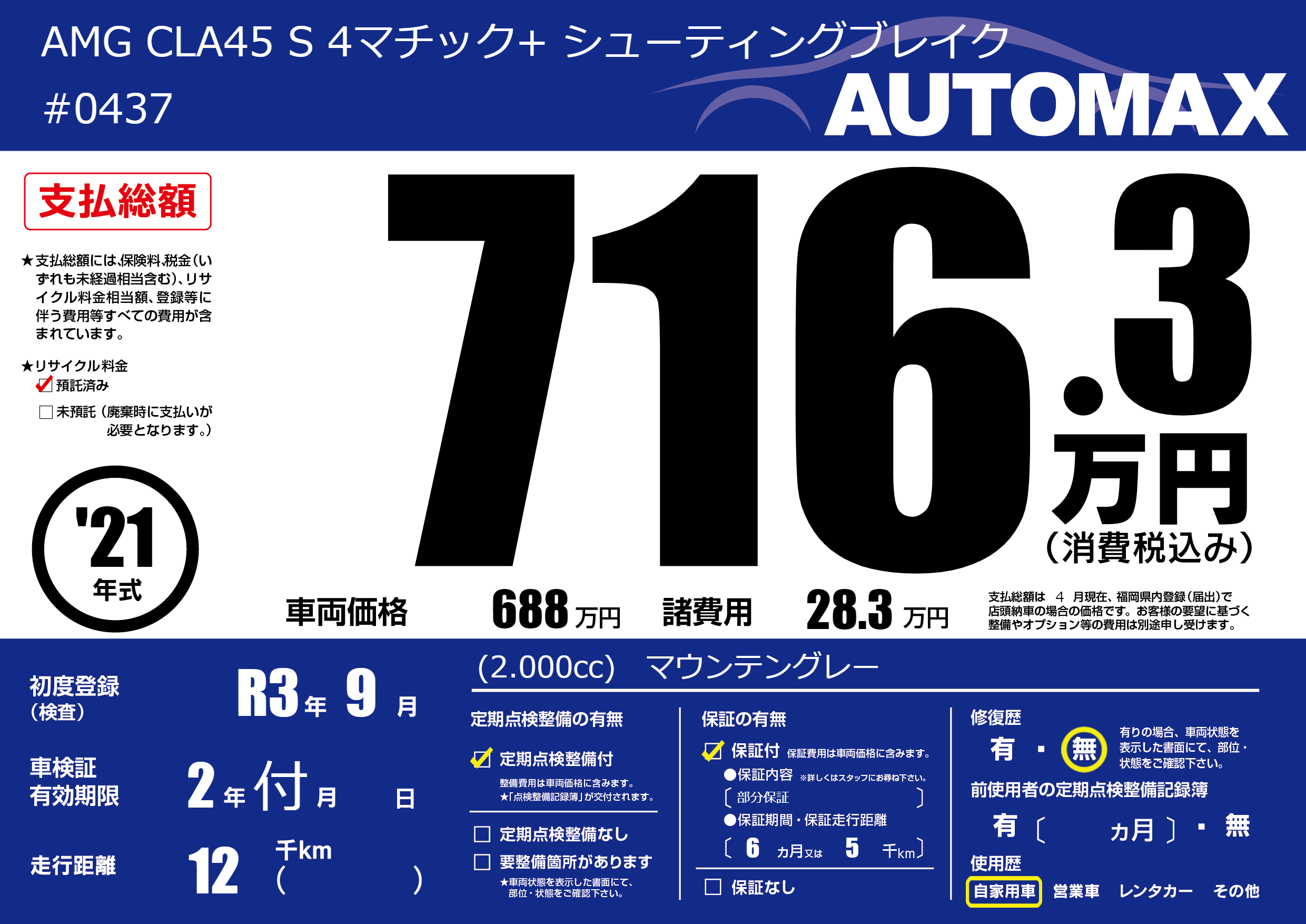 | 車名 | AMG CLA45 S 4マチック+ シューティングブレイク | グレード ミッション 排気量 |